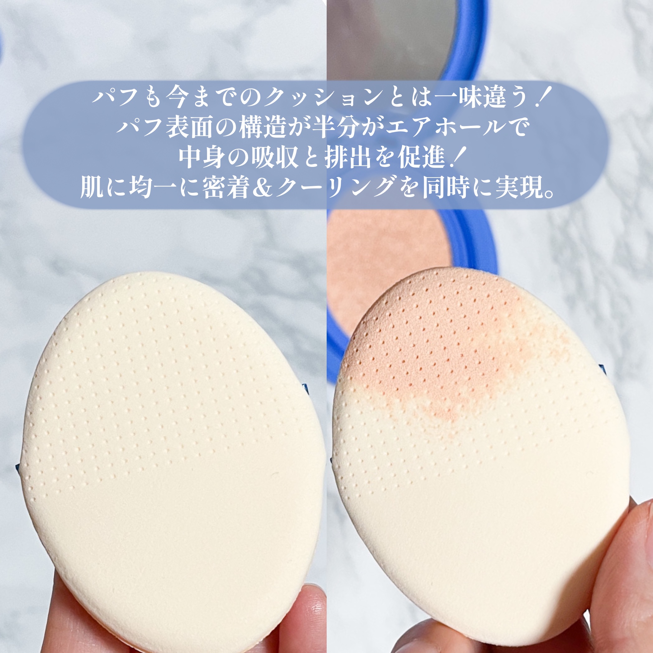 - SPF 50+ PA++++ ◇ひんやり感のある成分でクールな使い心地 ①水分クール感 FREEZEAWAY ✓ *全成分:ブチレングリコール、メンチルピーシーエー、エチルメンタンカボクサイド ②水分バリア AQUA CERAMIDE ✓ 肌保湿及びクール感 *全成分:グリセリン、精製水、カプリリック/カプリクトライグリセライド、ハイドロジェネ テッドレシチン、セラミドNP、ソジウムステアロールグルタミン酸 ③クール COOL GREEN COMPLEX ✓ 肌保湿及びクール感 *全成分:グリセリン、精製水、ポルスアップルミント葉エキス、緑茶エキス、タイム葉エキス ◇長時間メイクキープができるファンデーションいらずの日焼け止め 華やかなアプリコット色のトーンアップ*カバーで自然で健康的な肌印象に仕上げます。ファンデーションの代わりとして利用できるため、肌にも優しい使い心地、忙しい朝にもぴったりです。マスクを付けても崩れにくく、白浮きがしにくいなめらかな密着で長時間メイクをキープしてくれます。 *メイクアップ効果による ◇塗りやすい卵型のパフ パフは塗りやすい卵型を採用しました。パフ表面のエアホールにより、肌へ均一に密着&クール感をもたらします。
