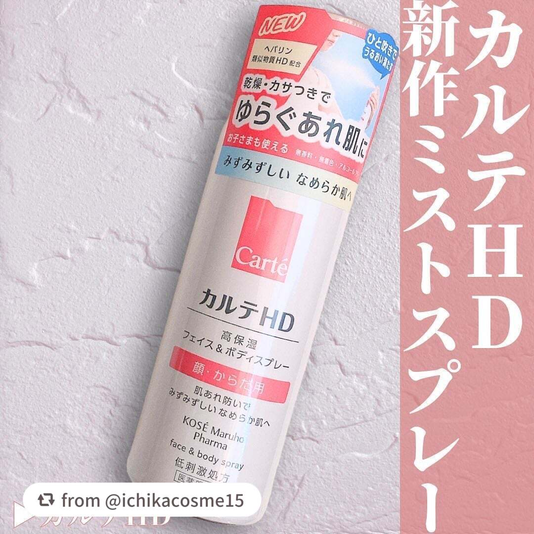 - 【全身用高保湿スプレー】 コーセーとマルホの合弁会社コーセーマルホファーマから発売された「カルテHD」。 エアゾールタイプの化粧水としては「初めて※1」ヘパリン類似物質HD※2を配合した全身用スプレー化粧水です。 配合のヘパリン類似物質HDはマルホから唯一供給を受けた「ヘパリン類似物質HD」を配合。 しっとり感とみずみずしさを叶える極上のミストが、すばやく広がり、全身をみずみずしいうるおいでふわっと包みます。 しっとりうるおうのにべたつかない軽やかな使い心地で、いつでもどこでも手軽な高保湿ケアを実現。 24時間乾燥の隙なし習慣を叶えます。 毎日のお顔のお手入れはもちろん、手の届きにくい背中などのボディケアや 子どもの全身保湿・男性のスキンケアなど幅広い場面で活躍。 うるおい構造(角層ラメラ)を整えて、あれにくい肌にみちびきます。 <販売名:HDフェイスボディSP> ※1 コーセーグループ商品として ※2 保水有効成分ヘパリン類似物質のこと