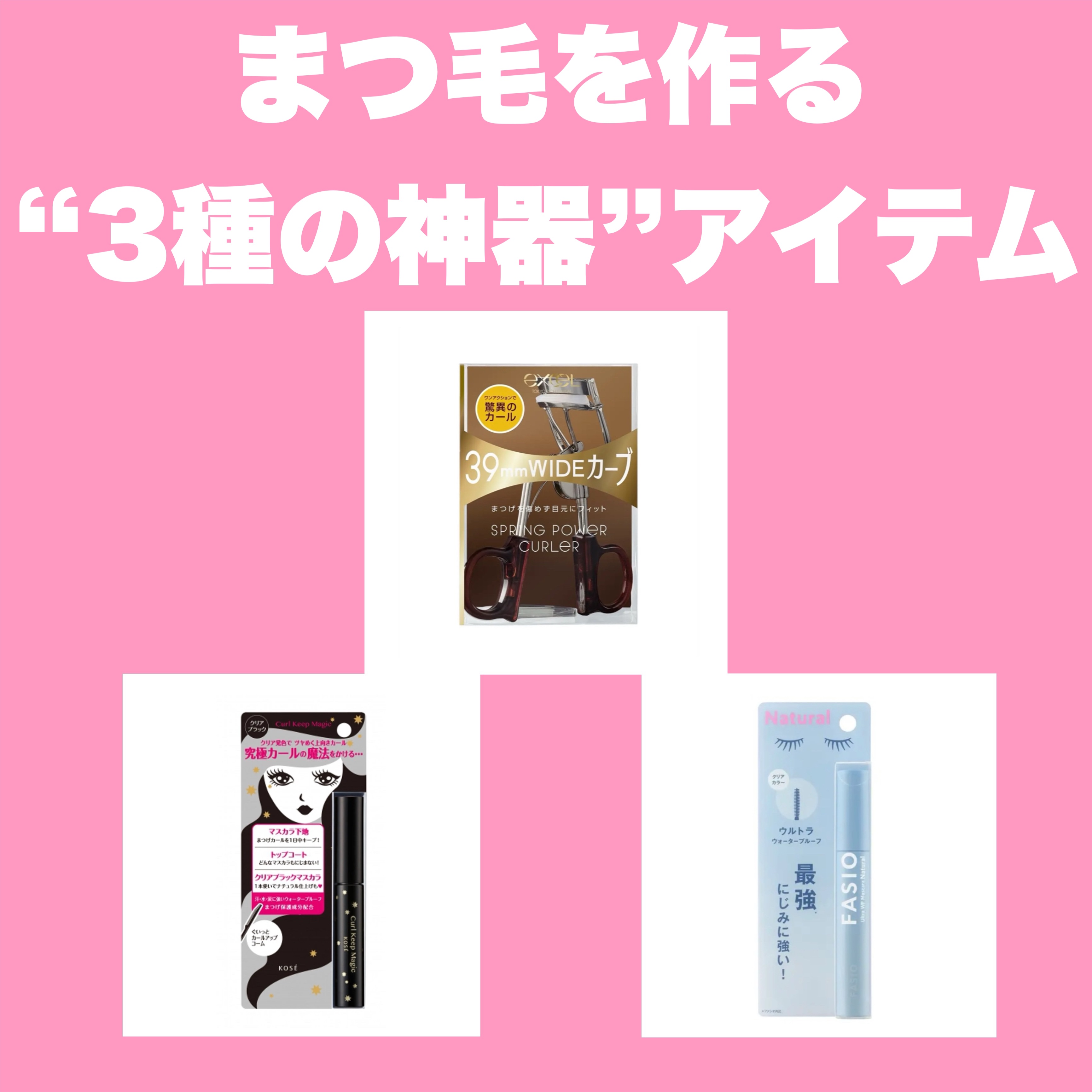 excel スプリングパワーカーラー 880円(税込) KOSE カールキープマジック(クリアブラック) 990円(税込) FASIO ウルトラ WP マスカラ(ナチュラル) 1320円(税込)