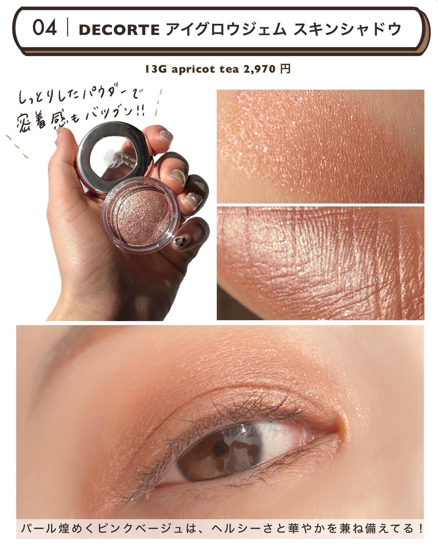 ぷにっとした弾力のある触り心地に、しっとりクリーミィなテクスチャー。 アイグロウジェムといえばこのカラーと言っても過言ではないくらい、初めましての方にもおすすめのカラーなんだとか✨ ちょっとオレンジ味もあるようなピンクベージュには繊細なラメがたっぷり、キラッキラと煌めきます。 でもここはさすがデコルテ、品があって透明感のあるラメ感なのでぎらつくこともなく、上品でうるっとしたアイメイクに。 そして肌馴染みの良いベージュにほんのりと感じるピンクが、じゅわっと滲み出るような血色感をプラスしてくれてこれまた可愛いんです…!ヌーディ過ぎない絶妙な色出しなので、これ単色で使っても充分すぎるくらい可愛い!時短にもなるのに抜け感が出てお洒落な雰囲気になれますよ〜! お値段も高過ぎないし、ラメの繊細な煌めきも美しいし、クリームみたいなテクスチャーなのによれにくいし、これは人気なのも納得だなあ。