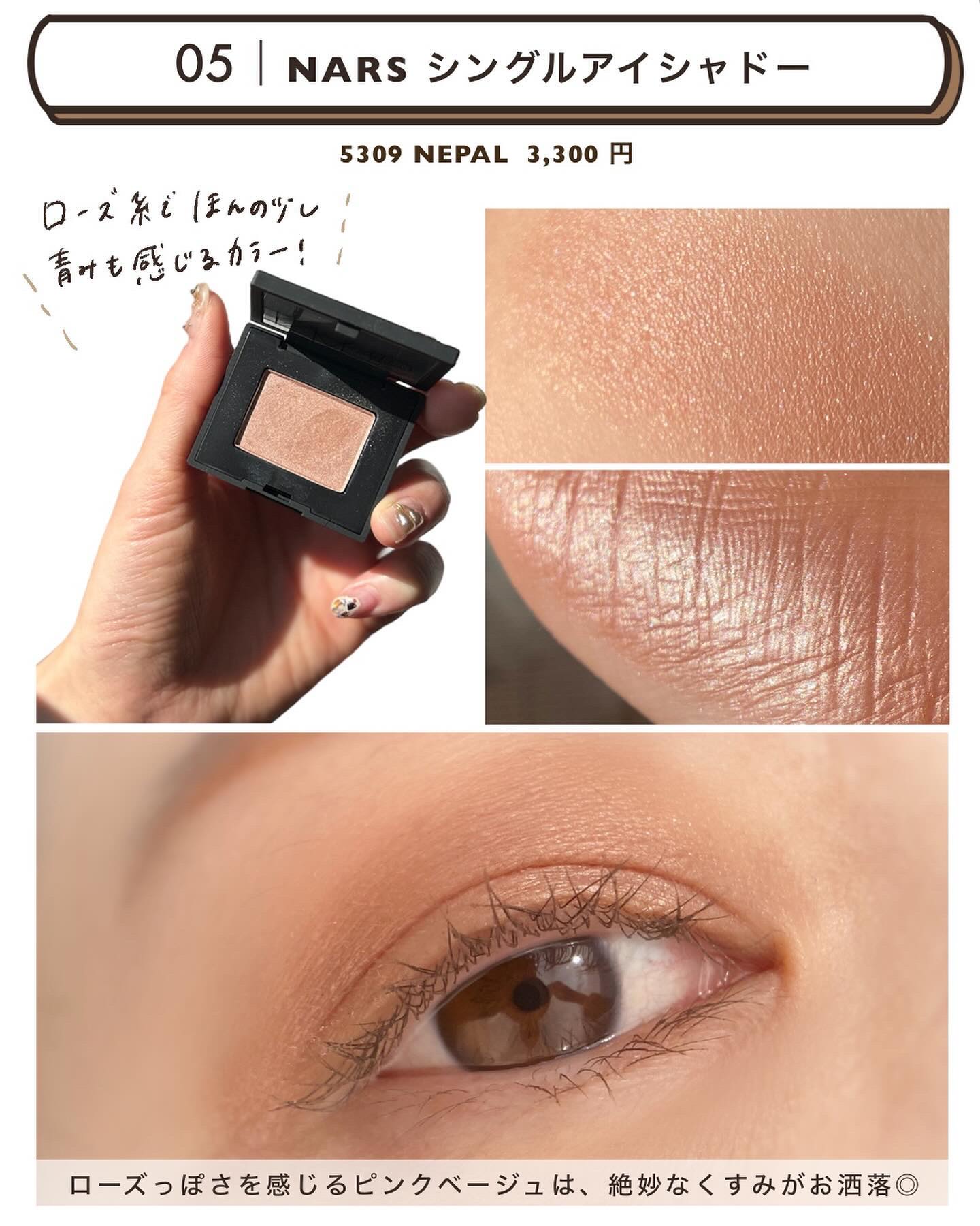 2023年にどどんとリニューアル!全30色展開で新たに発売をスタートしました。 多色パールがこれでもか!ってくらいたっぷり煌めくピンクベージュはほんの少しオレンジのニュアンスも感じられるヘルシーなカラー。 こういうピンクベージュ系の単色シャドウって、ほんとにメイクのベース的に使いやすくて重宝するのよね😚