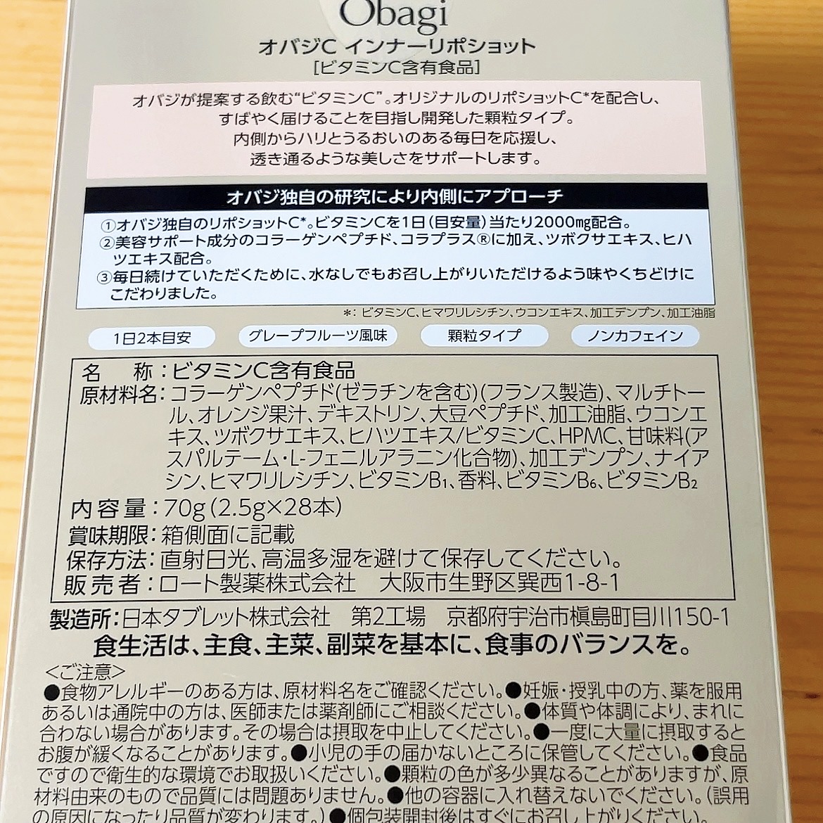 - オバジが提案する飲む“ビタミンC”。オリジナルのリポショットC*を配合し、すばやく届けることを目指し開発した顆粒タイプ。内側からハリとうるおいのある毎日を応援し、透き通るような美しさをサポートします。 <オバジ独自の研究により内側にアプローチ> 1. オバジ独自のリポショットC*。ビタミンCを1日(目安量)当たり2000mg配合。 2. 美容サポート成分のコラーゲンペプチド、コラプラス®に加え、ツボクサエキス、ヒハツエキス配合。 3. 毎日続けていただくために、水なしでもお召し上がりいただけるよう味やくちどけにこだわりました。 ・グレープフルーツ風味 ・顆粒タイプ ・ノンカフェイン *ビタミンC、ヒマワリレシチン、ウコンエキス、加工デンプン、加工油脂