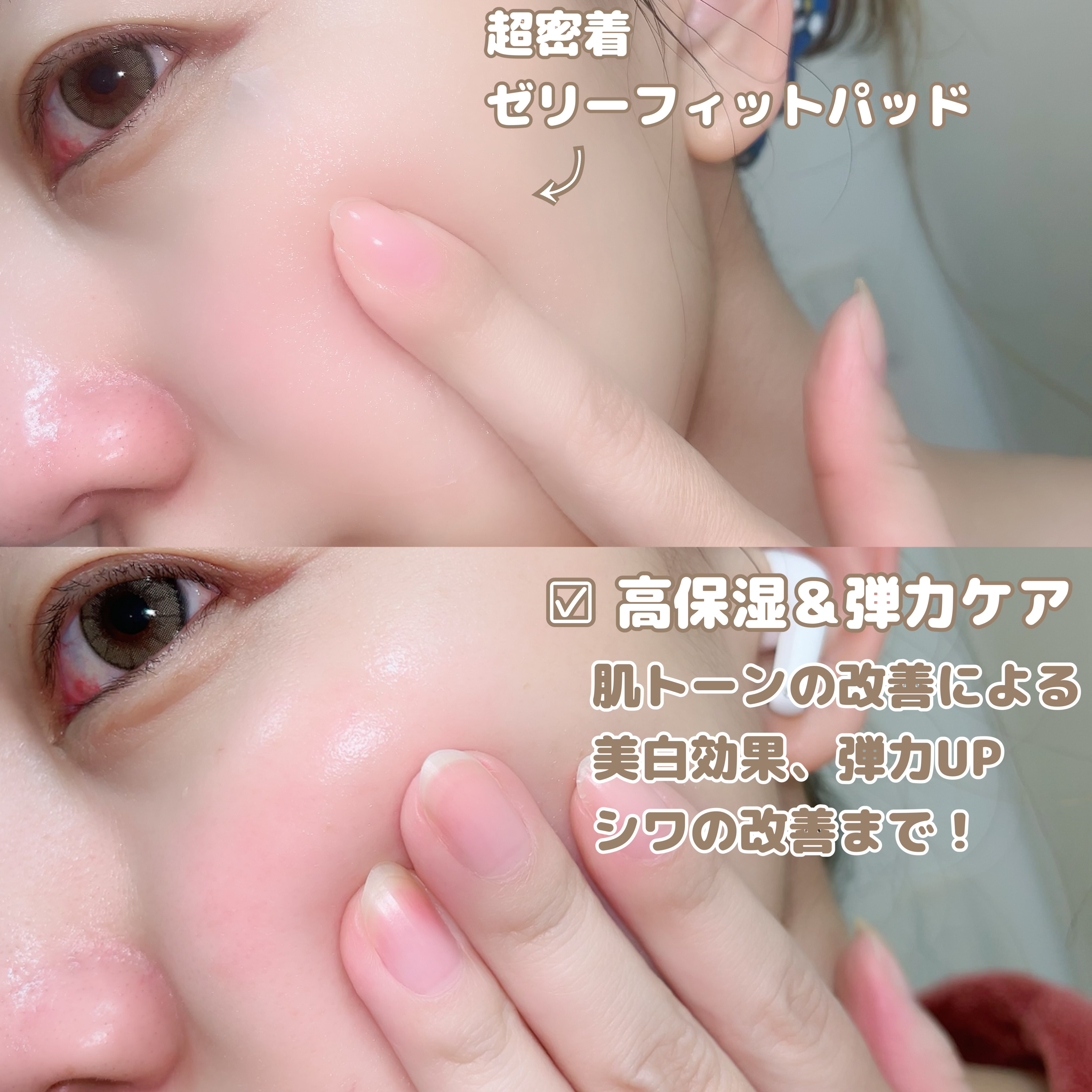 - 薄くて柔らかいパッドがぴったりお肌に密着し、たっぷりのコラーゲンとヒアルロン酸8種のフルーツ由来エキスをしっかりお肌に届けます。 うるおいとハリに満ちたぷるぷる肌へ導きます。 お肌にピタッと密着して落ちにくい密着ゼリーフィットパッド採用!