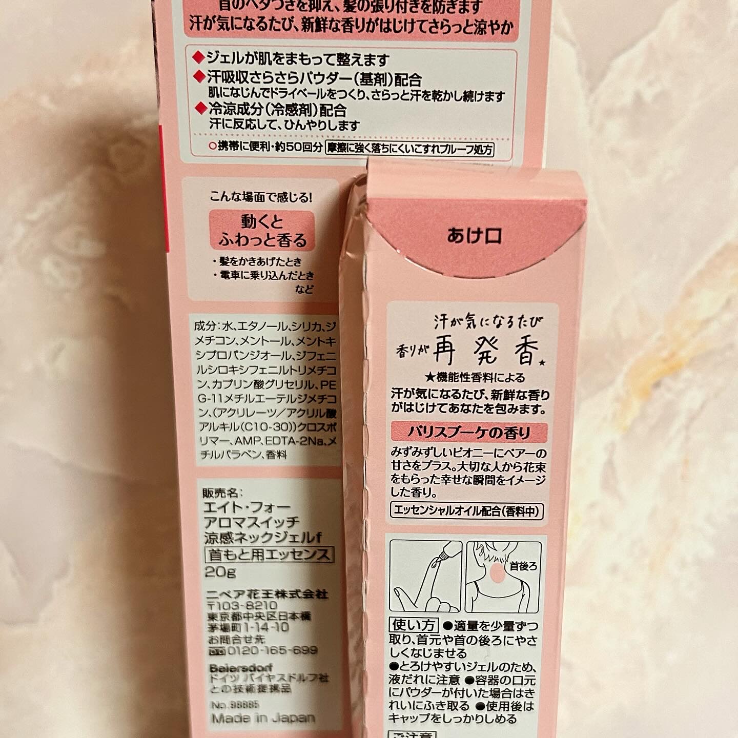 8x4からいただきました。これから暑くなり、汗のべたつき、髪の毛の張り付きが気になる季節にオススメ☀️8×4アロマスイッチ 涼感ネックジェル パリスブーケの香り《特徴》✴︎首のベタつきを抑え、髪の張り付きを防いでくれる✴︎汗が気になるたびに、...