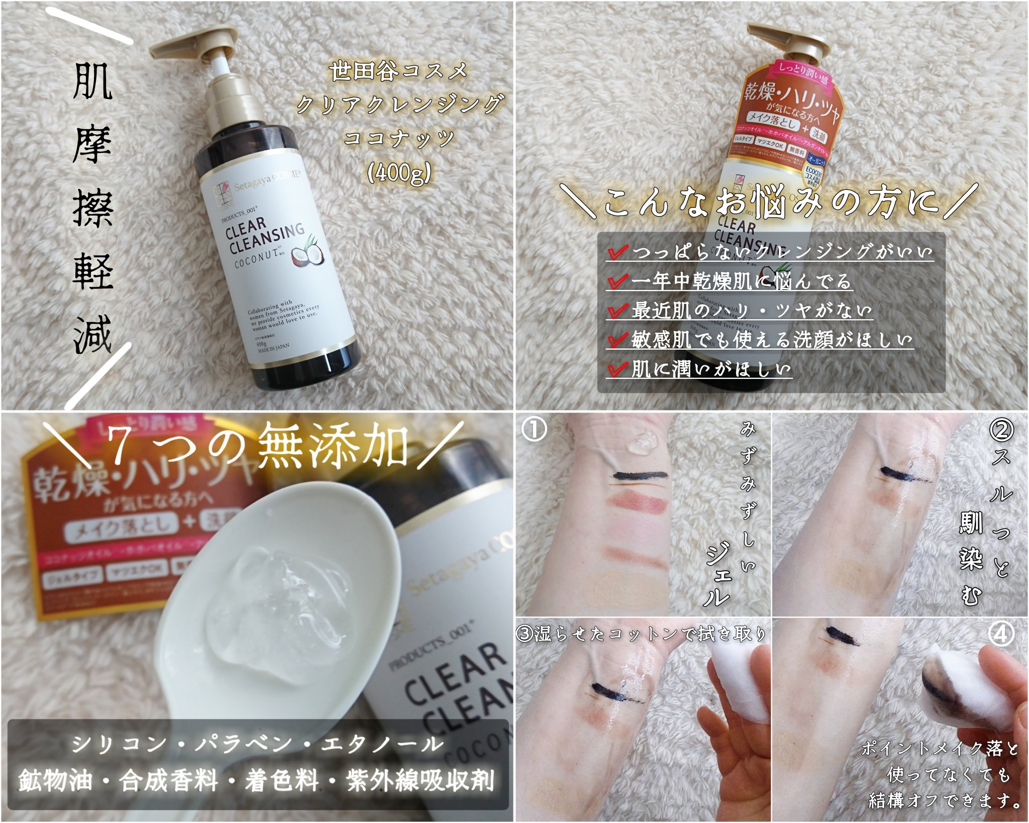 世田谷コスメ「クリアクレンジング ココナッツ」は、乾燥対策や肌ツヤケアにおすすめのクレンジングジェルです。5種類の植物オイルが配合されていて、つっぱらずしっとりとして洗い上がりに特化しています。 香りも重曹の香りだと思いますが、香料ではない自然な香りで安心ですね。 なお落とした後もスッキリというよりは、うるおいを残して汚れだけ落としている感じがします。