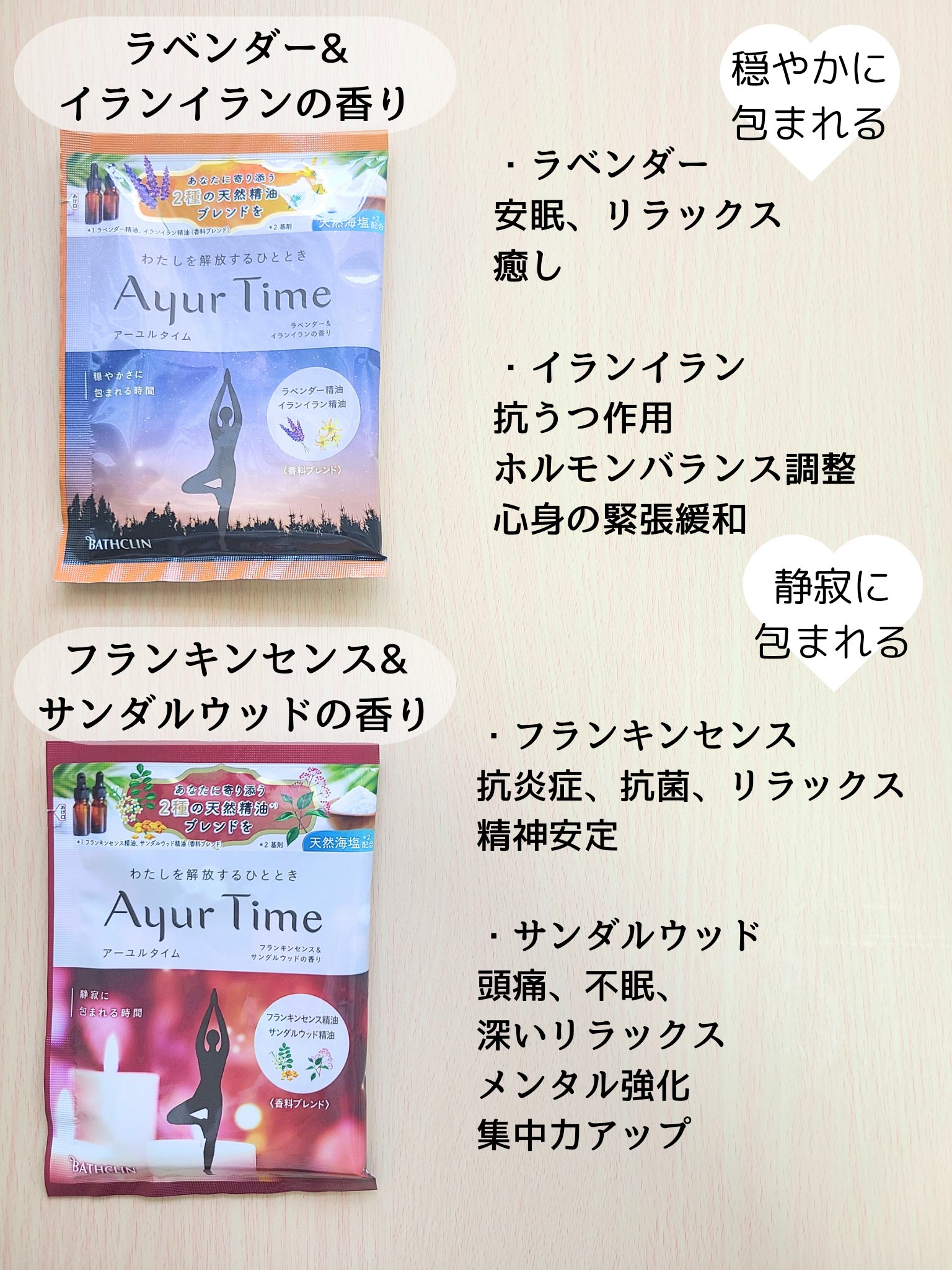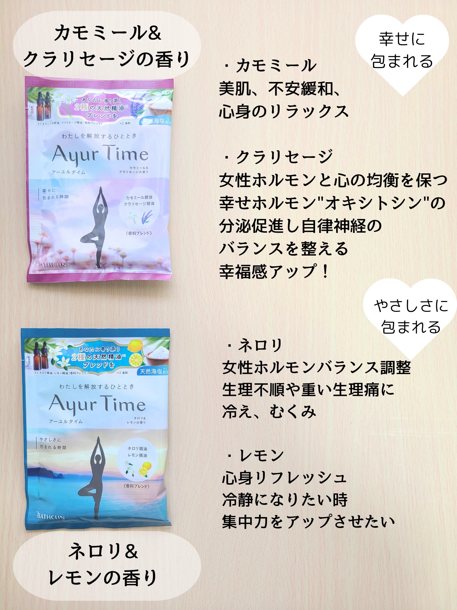 いつもなにかしら入浴時には入浴剤を入れているので、色々使ってきてはいるけれど、香りでとても心に残ったのがこのアユールタイム。 ラベンダー&イランイラン ネロリ&レモン フランキンセンス&サンダルウッド カモミール&クラリセージ レモングラス&ベルガモット ユーカリ&シダーウッド の6種類ですが、どれも素敵な香り。 子どもとなので、バタバタはしていますが、香りのおかげで その中でも癒されるひとときを送ることができています。香りってほんと大事! 天然精油配合と、保湿成分のオリエンタルハーブ マチルスエキス、オーガニック セサミオイル配合だそうで、保湿も叶うのが嬉しい。 この入浴剤は、粉ではなく海塩です。海塩の粒に色がついているので、お湯に溶かして入浴します。