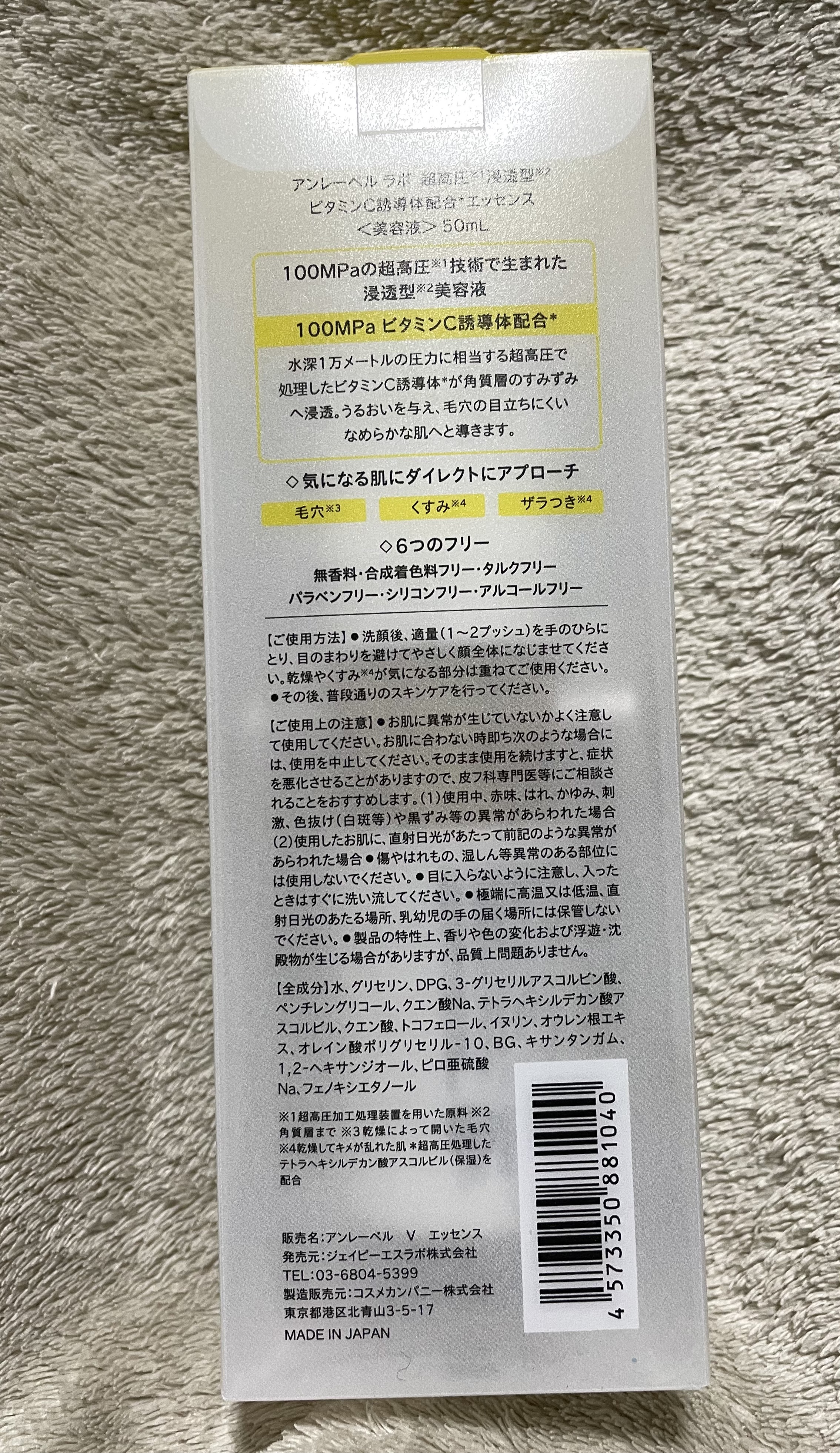 - <V エッセンス> 水、グリセリン、DPG、3-グリセリルアスコルビン酸、ペンチレングリコール、クエン酸Na、テトラヘキシルデカン酸アスコルビル、クエン酸、トコフェロール、イヌリン、オウレン根エキス、オレイン酸ポリグリセリル-10、BG、キサンタンガム、1,2-ヘキサンジオール、ピロ亜硫酸Na、フェノキシエタノール