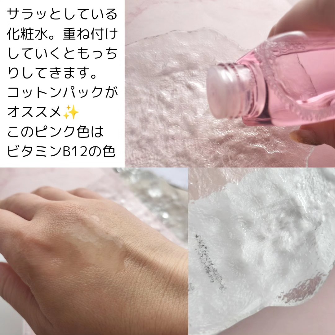 ティーツリーやツボクサ成分(CICA)が配合されているトナー.′.′ ピンク色でふんわりお花みたいなかわいらしい香りです🌷˒˒* このピンク色は自然成分[ビタミンB12]の本来の色で、ビタミンB12は荒れた肌に水分と活力を与え肌環境を整えてくれるんだって✨✨ セラミドNPやアラントインなどの成分が入っていて、保湿と肌荒れ予防を同時にケアしたい人に◎