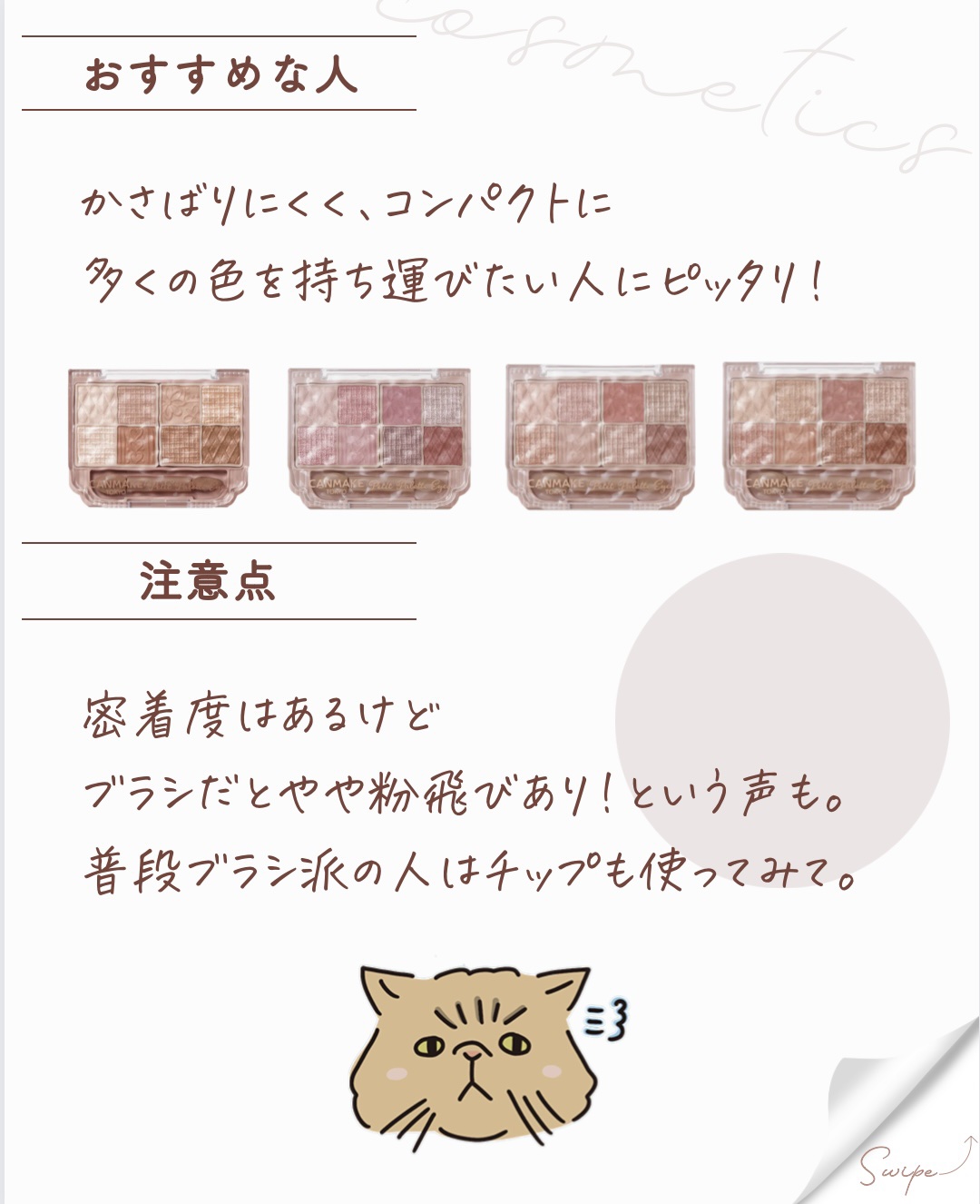- 持ち歩ける多色パレットがキャンメイクから登場! 捨て色なしの8色入り&チップ付! 「持ち歩けること」や「外出先でもメイク直しができること」を重視した多色パレット。 持ち運びやすいサイズ感なのに、贅沢に8色入りです。 さらに便利なダブルエンドチップまで! マット×パール×ラメなど、組み合わせ方はあなたの自由! 自分好みのアイメイクを楽しめます。