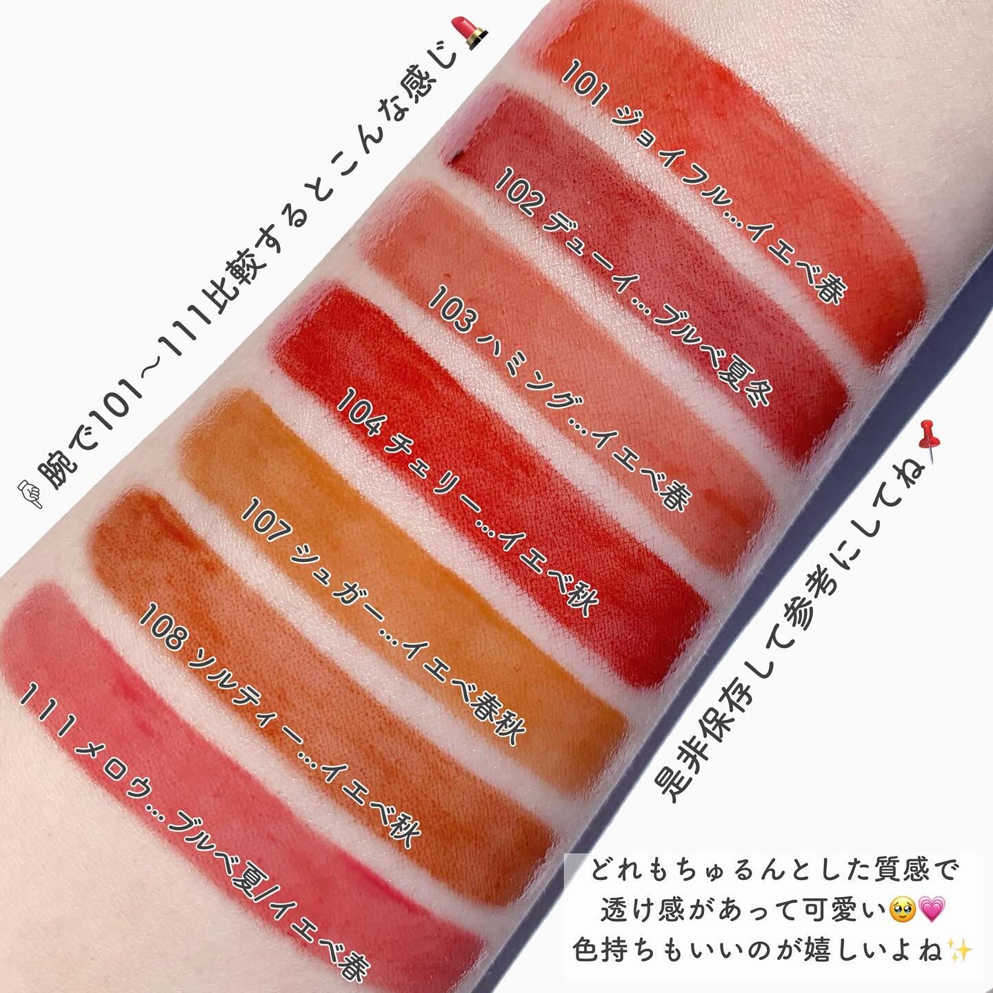 - <101 ジョイフル> 水、リンゴ酸ジイソステアリル、ダイマージリノール酸(フィトステリル/イソステアリル/セチル/ステアリル/ベヘニル)、ジイソステアリン酸ダイマージリノレイル、ノナイソステアリン酸ポリグリセリル-10、オクチルドデカノール、ビスジグリセリルポリアシルアジペート-2、水添ポリイソブテン、セチルPEG/PPG-10/1ジメチコン、ポリソルベート60(小麦由来)、イソステアリン酸ソルビタン(小麦由来)、1,2-ヘキサンジオール、グリセリン、ベヘニルアルコール、(アクリル酸/MA)コポリマーNa、ペンチレングリコール、BG、ポリアクリレート-13、トロメタミン、(アクリレーツ/アクリル酸アルキ ル(C10-30 )クロスポリマー、エチルヘキシルグリセリン、ポリイソブテン、(アクリル酸ヒドロキシエチル/アクリロイルジメチルタウリンNa)コポリマー、スクワラン、デヒドロ酢酸、ステビオシド、香料、フィチン酸、カプリリルグリコール、ジメチコン、水添ロジン酸メチル、水酸化Al、ポリソルベート20(小麦由来)、トコフェロール、ライム果汁、キイチゴ果汁、レモン果汁、マンゴー果汁、フラガリアチロエンシス果汁、アンズ果汁、オレンジ果汁、グレープフルーツ液汁、キウイ果汁、パパイア果汁、[+/-]酸化チタン、黄4、黄5、赤 104(1)、赤227、青1 <102 デューイ> 水、リンゴ酸ジイソステアリル、ダイマージリノール酸(フィトステリル/イソステアリル/セチル/ステアリル/ベヘニル)、ジイソステアリン酸ダイマージリノレイル、ノナイソステアリン酸ポリグリセリル-10、オクチルドデカノール、ビスジグリセリルポリアシルアジペート-2、水添ポリイソブテン、セチルPEG/PPG-10/1ジメチコン、ポリソルベート60(小麦由来)、イソステアリン酸ソルビタン(小麦由来)、1,2-ヘキサンジオール、グリセリン、ベヘニルアルコール、(アクリル酸/MA)コポリマーNa、ペンチレングリコール、BG、ポリアクリレート-13、トロメタミン、(アクリレーツ/アクリル酸アルキル(C10-30))クロスポリマー、エチルヘキシルグリセリン、ポリイソブテン、(アクリル酸ヒドロキシエチル/アクリロイルジメチルタウリンNa)コポリマー、スクワラン、デヒドロ酢酸、ステビオシド、香料、フィチン酸、ジメチコン、水添ロジン酸メチル、水酸化Al、カプリリルグリコール、ポリソルベート20(小麦由来)、トコフェロール、ライム果汁、キイチゴ果汁、レモン果汁、マンゴー果汁、フラガリアチロエンシス果汁、アンズ果汁、オレンジ果汁、グレープフルーツ液汁、キウイ果汁、パパイア果汁、酸化チタン、赤227、黄5、黄4、青1 <103 ハミング> 水、リンゴ酸ジイソステアリル、ダイマージリノール酸(フィトステリル/イソステアリル/セチル/ステアリル/ベヘニル)、ジイソステアリン酸ダイマージリノレイル、ノナイソステアリン酸ポリグリセリル-10、オクチルドデカノール、ビスジグリセリルポリアシルアジペート-2、水添ポリイソブテン、セチルPEG/PPG-10/1ジメチコン、ポリソルベート60(小麦由来)、イソステアリン酸ソルビタン(小麦由来)、1,2-ヘキサンジオール、グリセリン、ベヘニルアルコール、(アクリル酸/MA)コポリマーNa、ペンチレングリコール、BG、ポリアクリレート-13、トロメタミン、(アクリレーツ/アクリル酸アルキル(C10-30))クロスポリマー、エチルヘキシルグリセリン、ポリイソブテン、(アクリル酸ヒドロキシエチル/アクリロイルジメチルタウリンNa)コポリマー、スクワラン、デヒドロ酢酸、ステビオシド、香料、フィチン酸、ジメチコン、水添ロジン酸メチル、水酸化Al、カプリリルグリコール、ポリソルベート20(小麦由来)、トコフェロール、ライム果汁、キイチゴ果汁、レモン果汁、マンゴー果汁、フラガリアチロエンシス果汁、アンズ果汁、オレンジ果汁、グレープフルーツ液汁、キウイ果汁、パパイア果汁、酸化チタン、黄5、赤227、青1 <104 チェリー> 水、リンゴ酸ジイソステアリル、ダイマージリノール酸(フィトステリル/イソステアリル/セチル/ステアリル/ベヘニル)、ジイソステアリン酸ダイマージリノレイル、ノナイソステアリン酸ポリグリセリル-10、オクチルドデカノール、ビスジグリセリルポリアシルアジペート-2、水添ポリイソブテン、セチルPEG/PPG- 10/1ジメチコン、イソステアリン酸ソルビタン(小麦由来)、ポリソルベート60(小麦由来)、1,2-ヘキサンジオール、グリセリン、ベヘニルアルコール、(アクリル酸/MA)コポリマーNa、ペンチレングリコール、BG、ポリアクリレート-13、ト ロメタミン、(アクリレーツ/アクリル酸ア ルキル(C10-30))クロスポリマー、エチルヘキシルグリセリン、ポリイソブテ ン、(アクリル酸ヒドロキシエチル/アクリ ロイルジメチルタウリンNa)コポリマー、スクワラン、デヒドロ酢酸、ステビオシド、香料、カプリリルグリコール、ポリソルベー ト20(小麦由来)、トコフェロール、ライム果汁、キイチゴ果汁、レモン果汁、マンゴー 果汁、フラガリアチロエンシス果汁、アンズ 果汁、オレンジ果汁、グレープフルーツ液 汁、キウ