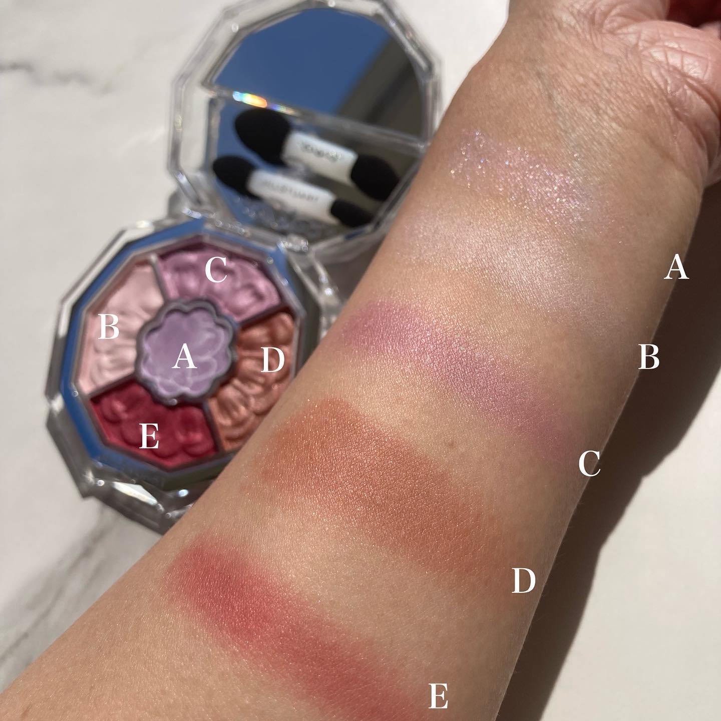 マットは肌に溶け込むような粉質でボソボソしません! シマーのしっとりした粉質も密着してくれて好き!!! 1番キラキラなのは右上のラメですね🍑💓でも粒が大きくないので、大人も使いやすいラメだと思います🥰 どの色使おうか迷うけど、どれ使っても本当可愛くて、自分が桃になったかのような🍑(笑)多幸感あふれるパレットです💘