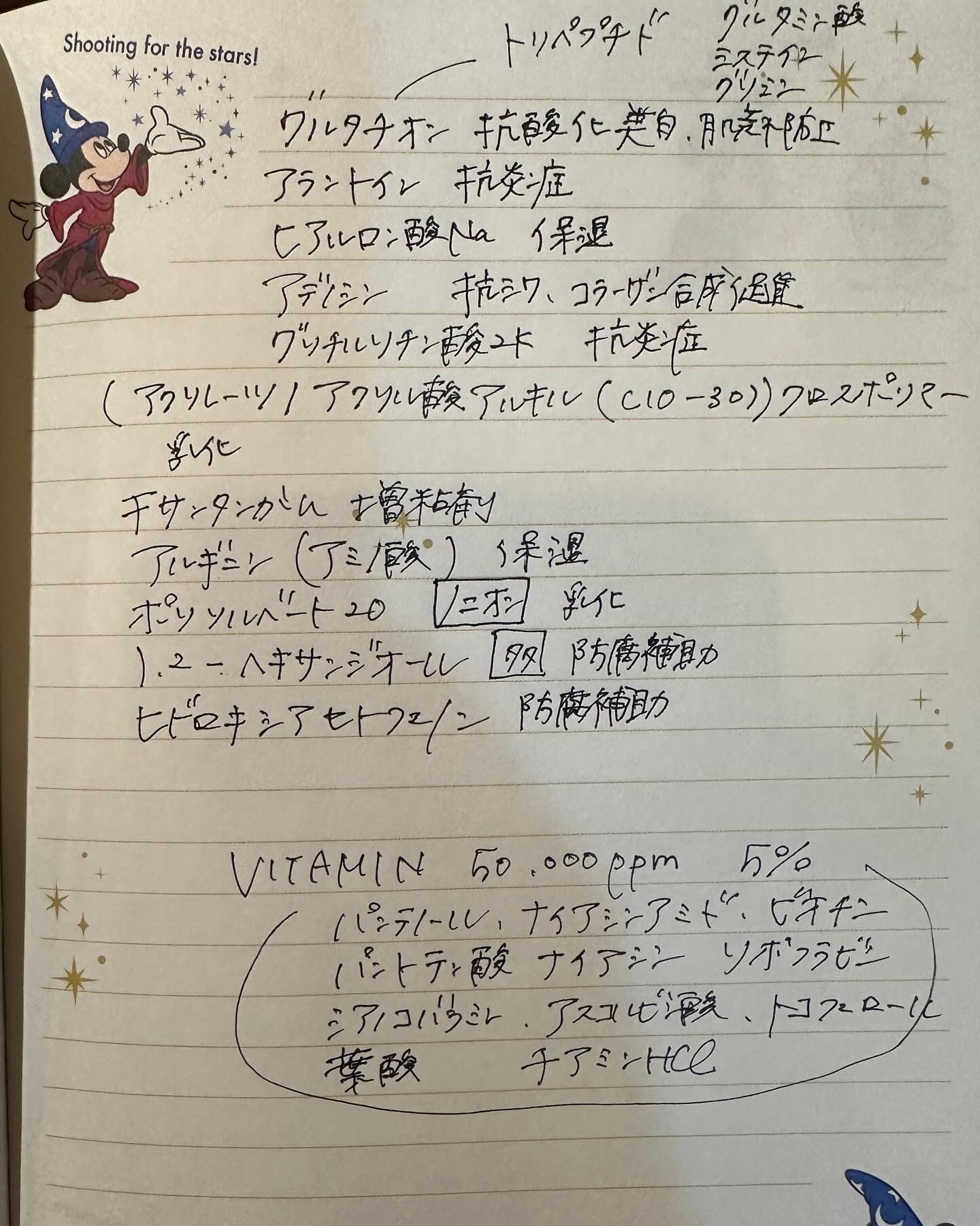 - <ハイドレイティング> 精製水(酸素水含む)、メチルプロパンジオール、グリセリン、ナイアシンアミド、パンテノール、ヒアルロン酸Na、トレハロース、パルミチン酸レチノール、チアミンHCl、リボフラビン、ナイアシン、カルニチンHCl、パントテン酸、ビオチン、葉酸、アスコルビン酸、トコフェロール、アラントイン、グリチルリチン酸2K、アデノシン、キサンタンガム、トロメタミン、(アクリレーツ/アクリル酸アルキル(C10-30))クロスポリマー、ポリソルベート20、ヒドロキシアセトフェノン、1,2-ヘキサンジオール <リフティング> 精製水、メチルプロパンジオール、グリセリン、ナイアシンアミド、パンテノール、ヒアルロン酸Na、トレハロース、オプンチアフィクスインジカ茎エキス、パルミチン酸レチノール、チアミンHCl、リボフラビン、ナイアシン、カルニチンHCl、パントテン酸、ビオチン、葉酸、アスコルビン酸、トコフェロール、アラントイン、グリチルリチン酸2K、アデノシン、キサンタンガム、トロメタミン、(アクリレーツ/アクリル酸アルキル(C10-30))クロスポリマー、ポリソルベート20、ヒドロキシアセトフェノン、1,2-ヘキサンジオール <リラクシング> 精製水、メチルプロパンジオール、グリセリン、ナイアシンアミド、パンテノール、ヒアルロン酸Na、トレハロース、アロエベラ葉エキス、パルミチン酸レチノール、チアミンHCl、リボフラビン、ナイアシン、カルニチンHCl、パントテン酸、ビオチン、葉酸、アスコルビン酸、トコフェロール、アラントイン、グリチルリチン酸2K、アデノシン、キサンタンガム、トロメタミン、(アクリレーツ/アクリル酸アルキル(C10-30))クロスポリマー、ポリソルベート20、ヒドロキシアセトフェノン、1,2-ヘキサンジオール <ホワイトニング> 精製水、メチルプロパンジオール、グリセリン、ナイアシンアミド、パンテノール、ヒアルロン酸Na、トレハロース、マンダリンオレンジ果実エキス、パルミチン酸レチノール、チアミンHCl、リボフラビン、ナイアシン、カルニチンHCl、パントテン酸、ビオチン、葉酸、アスコルビン酸、トコフェロール、アラントイン、グリチルリチン酸2K、アデノシン、キサンタンガム、トロメタミン、(アクリレーツ/アクリル酸アルキル(C10-30))クロスポリマー、ポリソルベート20、ヒドロキシアセトフェノン、1,2-ヘキサンジオール <バイタライジング > 精製水、パンテノール、メチルプロパンジオール、グリセリン、ナイアシンアミド、トレハロース、ヤマザクラ花エキス、加水分解コラーゲン、チアミンHCl、リボフラビン、ナイアシン、カルニチンHCl、パントテン酸、ビオチン、葉酸、アスコルビン酸、トコフェロール、シアノコバラミン、リノール酸グリセリル、リノレン酸グリセリル、アラキドン酸グリセリル、グルタチオン、アラントイン、ヒアルロン酸Na、アデノシン、グリチルリチン酸2K、(アクリレーツ/アクリル酸アルキル(C10-30))クロスポリマー、キサンタンガム、アルギニン、ポリソルベート20、1,2-ヘキサンジオール、ヒドロキシアセトフェノン <シカ> 精製水、パンテノール、メチルプロパンジオール、グリセリン、ナイアシンアミド、トレハロース、水添ホスファチジルコリン、トリ(カプリル酸/カプリン酸)グリセリル、アシアチコシド、マデカシン酸、アシアチン酸、ツボクサエキス、ステアリン酸スクロース、マデカッソシド、コレステロール、火山灰、チアミンHCl、リボフラビン、ナイアシン、カルニチンHCl、パントテン酸、ビオチン、葉酸、アスコルビン酸、トコフェロール、シアノコバラミン、リノール酸グリセリル、リノレン酸グリセリル、アラキドン酸グリセリル、アラントイン、ヒアルロン酸Na、アデノシン、グリチルリチン酸2K、(アクリレーツ/アクリル酸アルキル(C10-30))クロスポリマー、キサンタンガム、アルギニン、ポリソルベート20、1,2-ヘキサンジオール、ヒドロキシアセトフェノン <ポアタイトニング> 精製水、パンテノール、メチルプロパンジオール、グリセリン、ナイアシンアミド、トレハロース、温泉水、マンゴスチン果皮エキス、チアミンHCl、リボフラビン、ナイアシン、カルニチンHCl、パントテン酸、ビオチン、葉酸、アスコルビン酸、トコフェロール、シアノコバラミン、リノール酸グリセリル、リノレン酸グリセリル、アラキドン酸グリセリル、ダイオウショウ葉エキス、ウルムスダビディアナ根エキス、メマツヨイグサ花エキス、カッコンエキス、カラミン、アラントイン、ヒアルロン酸Na、アデノシン、グリチルリチン酸2K、(アクリレーツ/アクリル酸アルキル(C10-30))クロスポリマー、キサンタンガム、アルギニン、ポリソルベート20、1,2-ヘキサンジオール、ヒドロキシアセトフェノン