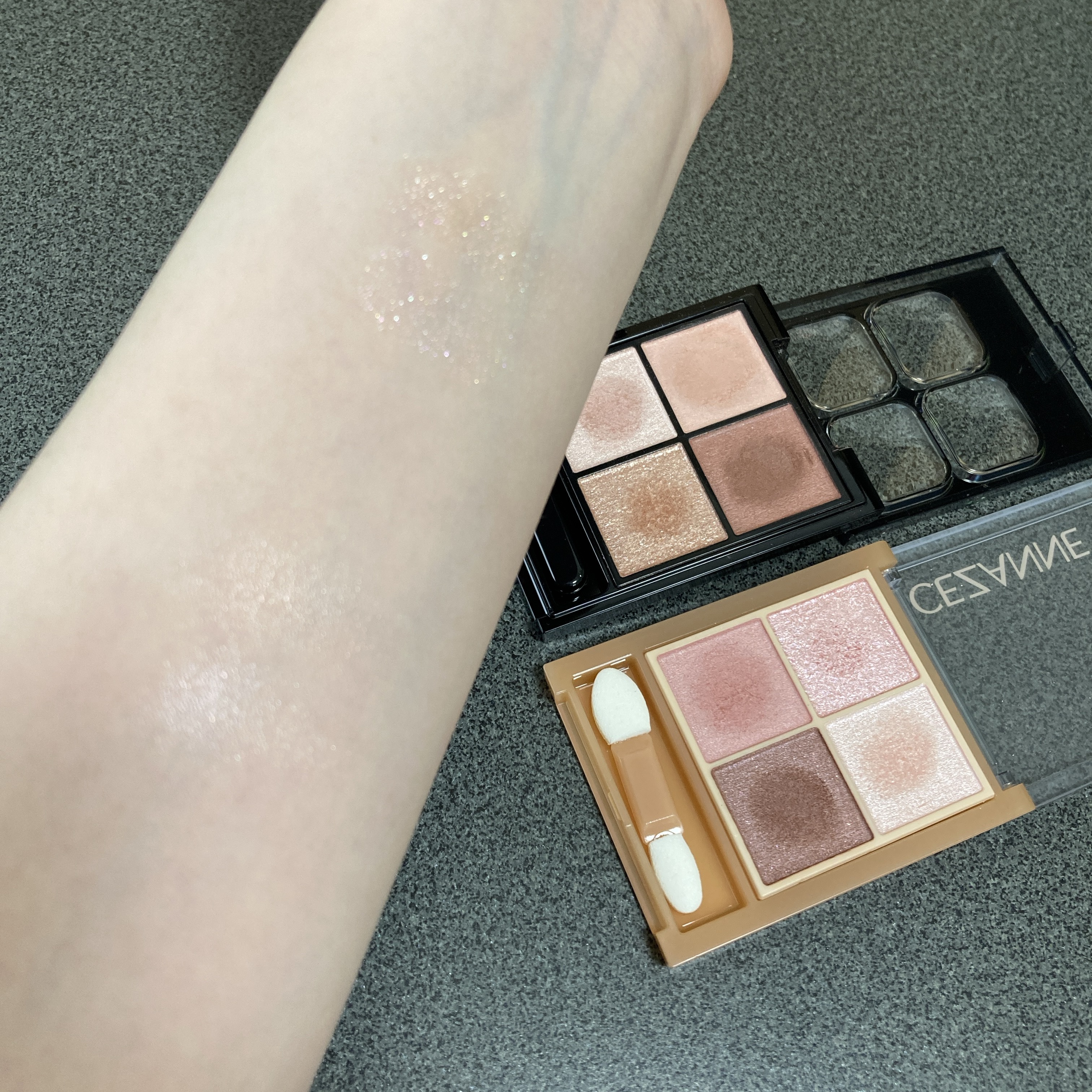 キャンメイク▷ピンクっぽい、鮮やか excel▷オレンジっぽい、淡くもできる キャンメイクはこちらをベースに推していることもあって、少し色がつきやすいかな? エクセルは最後に仕上げでニュアンス乗せる感じの使い方を推していたので少し薄いような。 少しキャンメイクの方がピンクみが強い。 コーラルピンク(?)は私の目には大差ないしいていうならやはりキャンメイクの方がピンクみが強い。 エクセルは透明感があって肌に溶け込むような印象 いちばん違うのは左下!パレットの段階から雰囲気違いますがキャンメイクの方が明るくピンク寄りエクセルは落ち着いたオレンジ寄り 右下の締め色どちらもそんなに暗くはないのかな?キャンメイクの方がはっきりつきやすくて、紫みが強い感じがします。エクセルはこちらの色でも透明感を感じる。どちらにも青っぽいラメが入ってます.