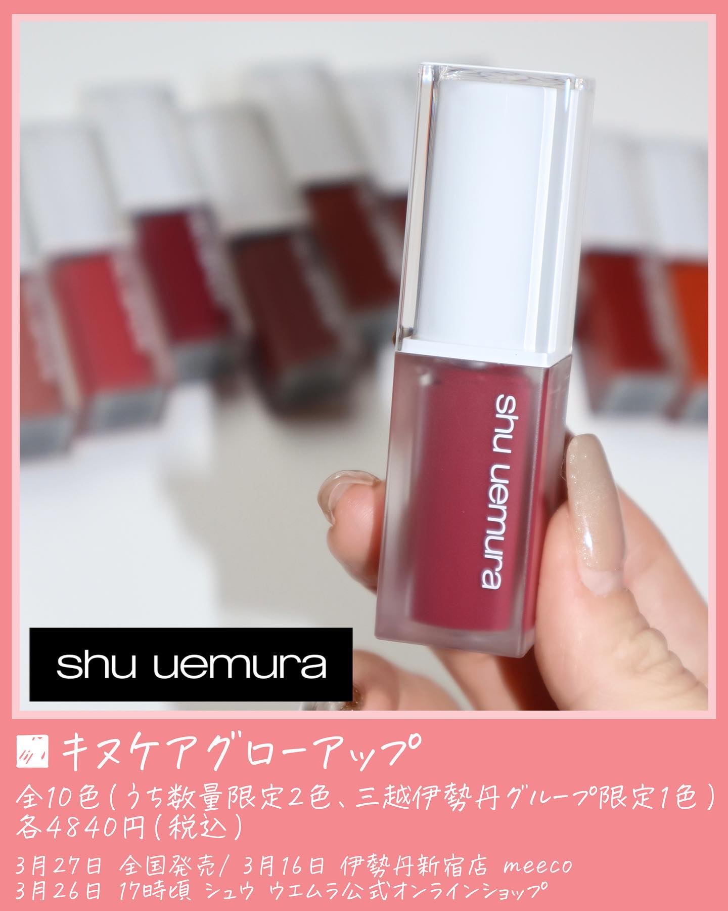2025年8月1日発売のキヌルージュクリームのスウォッチ!shuuemura#キヌルージュクリームBG943キヌベージュRD146ムースレッド(数量限定)RD192メルティルージュ(数量限定)PK333スフレピンクPK367ロージーク...