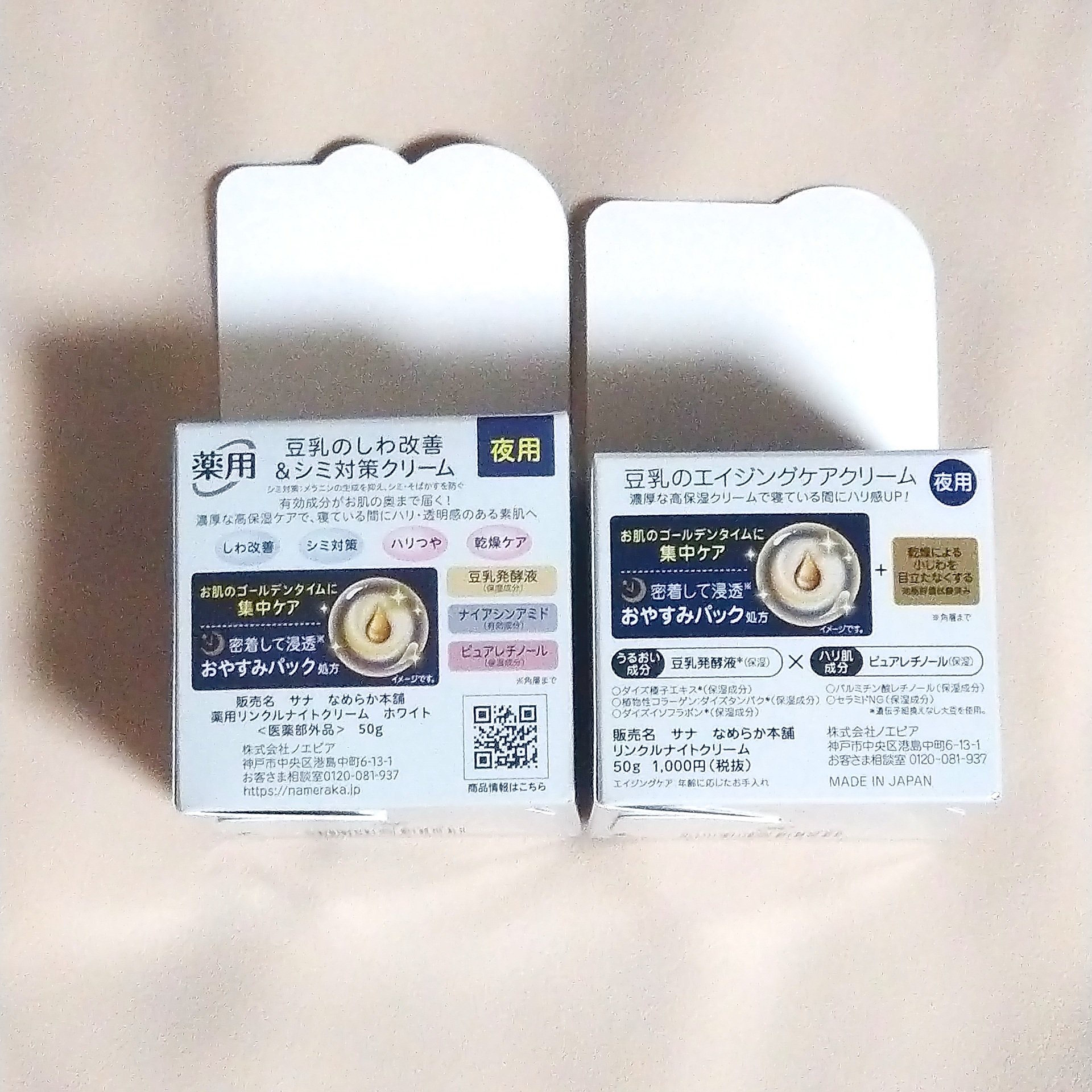 薬用にはナイアシンアミドが配合されたようです!美白、シミ予防等が期待できます。 薬用は白色 薬用の方が少し固め 夜スキンケアの最後に使用すれば朝までしっかり保湿してくれます。