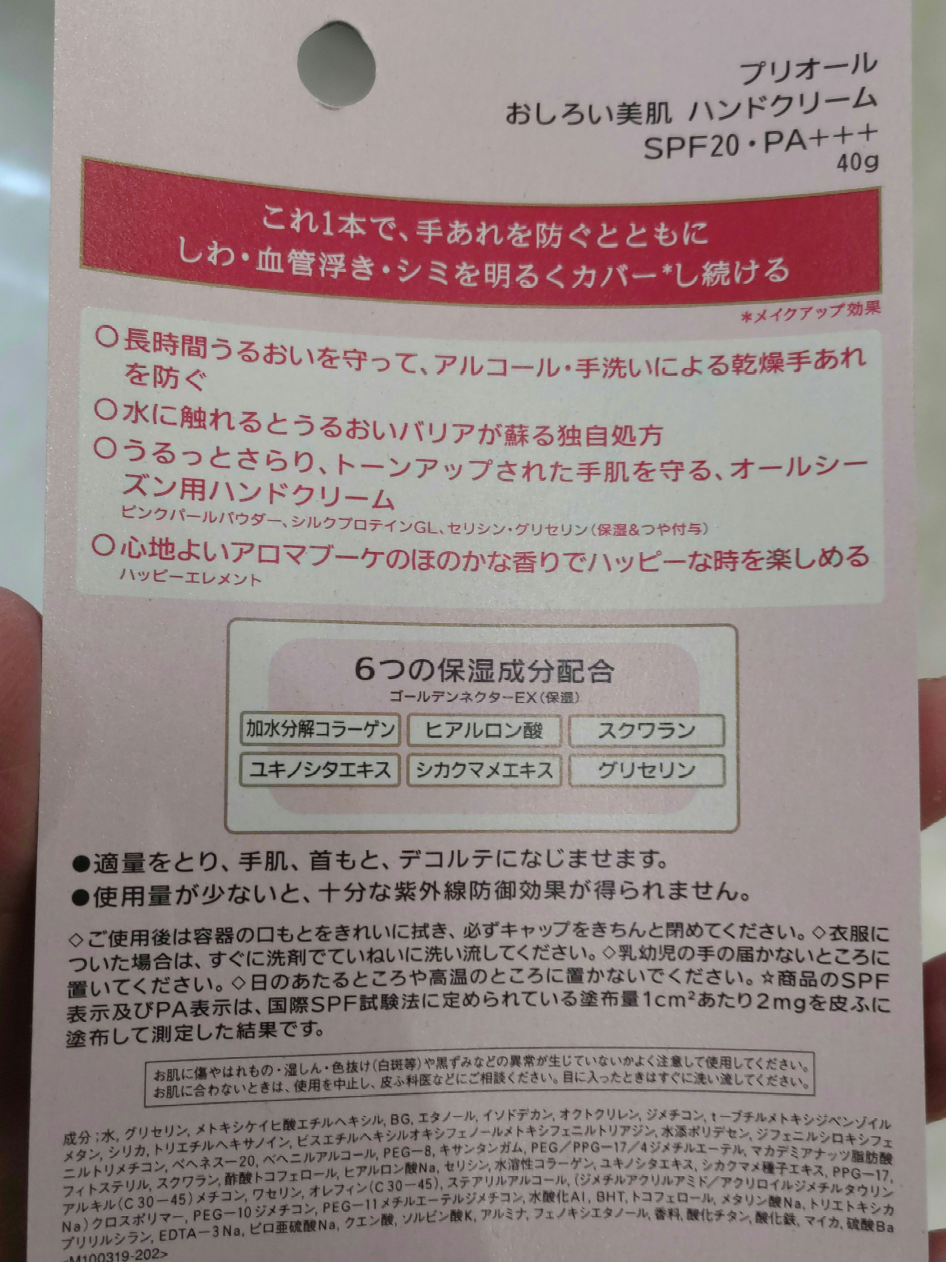 - SPF20・PA+++ ◆ 長時間うるおいを守って、アルコール・手洗いによる乾燥手あれを防ぐ。 ◆ 水に触れるとうるおいバリアがよみがえる独自処方を採用。 ◆ おしろい効果で、手肌をトーンアップ。ひと塗りで、しわ・シミ・血管浮きなどの年齢サインを明るくカバー。 ◆ プリオールのスキンケア共通の香り「ハッピーエレメント」配合。