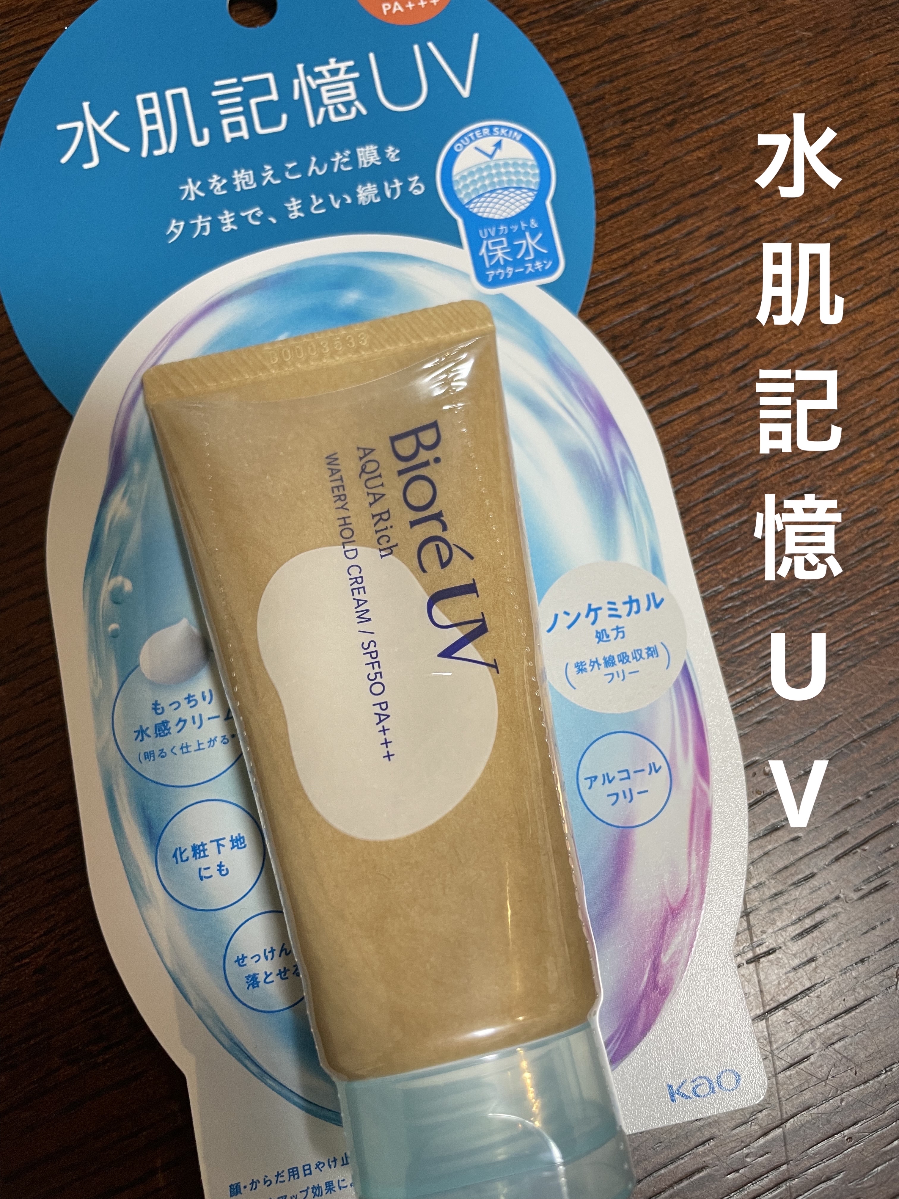 ビオレUVアクアリッチウォータリーホールドクリームみずみずしい使い心地の日焼け止め。ノンケミカル処方(紫外線吸収剤フリー)、アルコールフリー、パラベンフリー、着色料フリーで、せっけんで落とせます🫧優しい日焼け止めを探してる方におすすめ✨トーン...