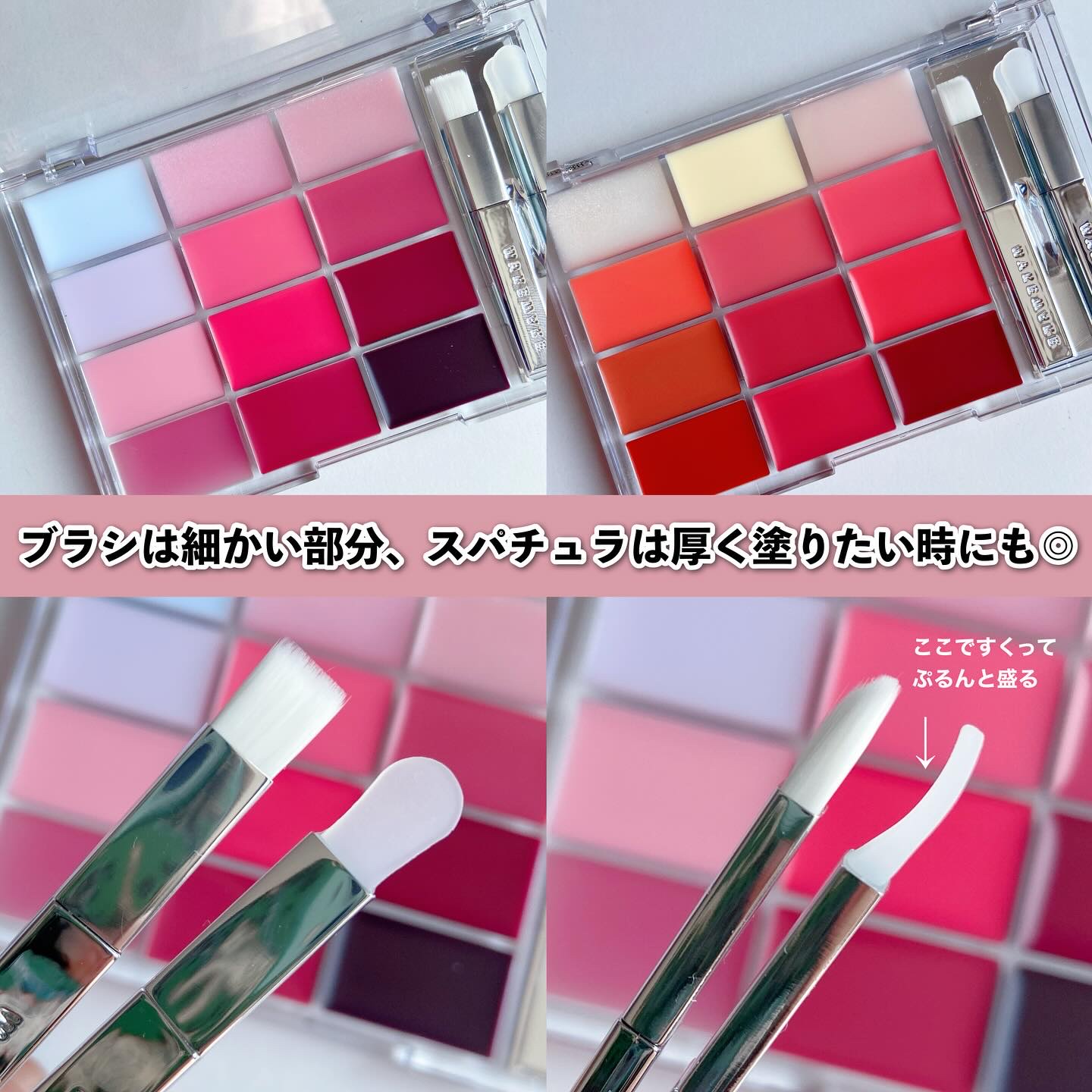 Qoo10で999円という破格で売られているリップパレット。持ち運びも塗り直しも面倒なイメージがあってパレットタイプのリップってどうなんだろう…🤔💭と思ってたんだけど安く売られてたら買うよね😂 配色がどストライクすぎる。ラメ入りはしっかりキラキラ✨で塗り広げてもしっかり存在感があってとても可愛い。 薄型パレットでチップもブラシもひとつになってるから案外持ち運びもラクでマジで買ってよかったのよね〜