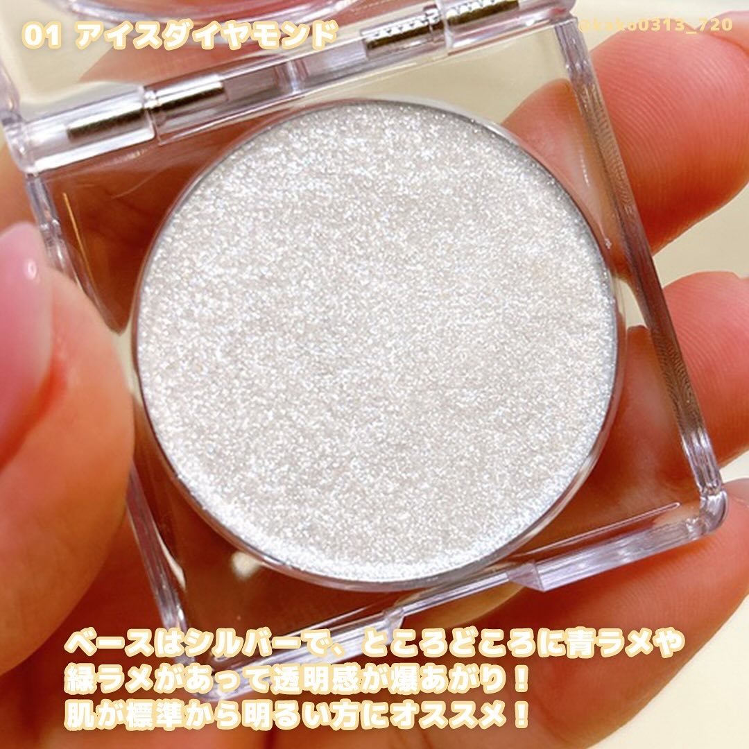 - ●ちらちら光る大粒ラメ配合 透明感のあるベースパールを配合。大粒のラメが隠れるのを防ぎ、輝度の高いラメが輝きを最大化。 ●粉飛びしにくいジェリータイプのハイライト なめらかなオイル※1を配合しジェリーのような保湿感のある塗り心地。ラメがぴったりと密着するので、大粒ラメも粉飛びの心配いらず。 ※1 イソノナン酸イソノニル、ホウケイ酸(Ca/チタン)、ホウケイ酸(Ca/Al)、酸化チタン ●さらりとした仕上がり バウンシータッチ処方※2を採用することで、保湿感があるのにソフトでさらりとした使用感を実現。 ※2 (HDI/トリメチロールヘキシルラクトン)クロスポリマー、(ジフェニルジメチコン/ビニルジフェニルジメチコン/シルセスキオキサン)クロスポリマー、ジメチコン、アルキル(C20-24)ジメチコン、ポリメチルシルセスキオキサン ●3種類の美容液成分配合でお肌をケア アロエベラ葉エキス、アルガンオイル※3、カニナバラ果実エキス(すべて保湿成分)配合。 ※3 アルガニアスピノサ核油