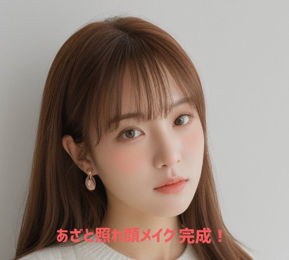 指にとり、ほおの中心から広げていく。濃くならないように少しづつのせる。 耳の上の方にチークをぬると、ほてったような照れ感が出せる。少しづつぬる。 鼻の頭にチークをひとぬりする。子犬のようなベビーフェイスを完成させる。