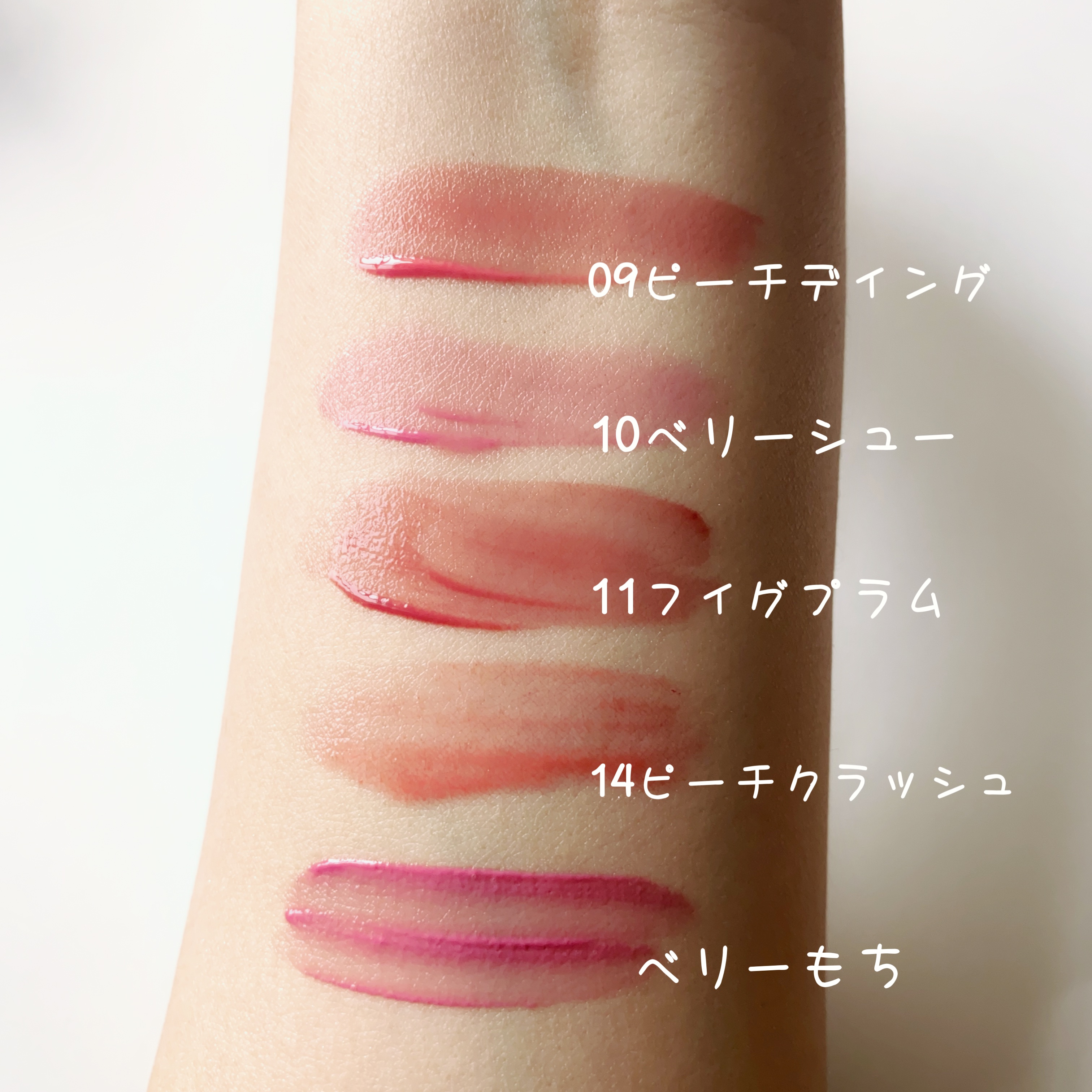 - <01 ムードマンゴー> 水、ジフェニルジメチコン、リンゴ酸ジイソステアリル、ビスジグリセリルポリアシルアジペート-2、ジグリセリン、水添ポリイソブテン、ダイマージリノール酸(フィトステリル/イソステアリル/セチル/ステアリル/ベヘニル)、ポリソルベート60、セチルPEG/PPG-10/1ジメチコン、DPG、ポリフェニルシルセスキオキサン、イソステアリン酸ソルビタン、ダイマージリノール酸ジイソステアリン酸ポリグリセリル-3、1,2-ヘキサンジオール、オクチルドデカノール、トリ(カプリル酸/カプリン酸)グリセリル、(アクリル酸ヒドロキシエチル/アクリロイルジメチルタウリンNa)コポリマー、セテアリルアルコール、酸化チタン、スクワラン、フェノキシエタノール、赤102、安息香酸ベンジル、エチルヘキシルグリセリン、黄4、香料、赤104(1)、水酸化Al、黄5、ポリアクリル酸アンモニウム、リナロール、BG、青1、塩化Na、ヘキシルシンナマル、トコフェロール <02 メロンシャーベット> 水、ジフェニルジメチコン、リンゴ酸ジイソステアリル、ビスジグリセリルポリアシルアジペート-2、ジグリセリン、水添ポリイソブテン、ダイマージリノール酸(フィトステリル/イソステアリル/セチル/ステアリル/ベヘニル)、ポリソルベート60、セチルPEG/PPG-10/1ジメチコン、DPG、ポリフェニルシルセスキオキサン、イソステアリン酸ソルビタン、ダイマージリノール酸ジイソステアリン酸ポリグリセリル-3、1,2-ヘキサンジオール、オクチルドデカノール、トリ(カプリル酸/カプリン酸)グリセリル、酸化チタン、(アクリル酸ヒドロキシエチル/アクリロイルジメチルタウリンNa)コポリマー、セテアリルアルコール、スクワラン、フェノキシエタノール、赤102、黄4、安息香酸ベンジル、エチルヘキシルグリセリン、赤104(1)、香料、水酸化Al、ポリアクリル酸アンモニウム、赤227、リナロール、BG、塩化Na、ヘキシルシンナマル、トコフェロール <03 ピンクグアバ> 水、ジフェニルジメチコン、リンゴ酸ジイソステアリル、ビスジグリセリルポリアシルアジペート-2、ジグリセリン、水添ポリイソブテン、ダイマージリノール酸(フィトステリル/イソステアリル/セチル/ステアリル/ベヘニル)、ポリソルベート60、セチルPEG/PPG-10/1ジメチコン、DPG、ポリフェニルシルセスキオキサン、イソステアリン酸ソルビタン、ダイマージリノール酸ジイソステアリン酸ポリグリセリル-3、1,2-ヘキサンジオール、オクチルドデカノール、トリ(カプリル酸/カプリン酸)グリセリル、(アクリル酸ヒドロキシエチル/アクリロイルジメチルタウリンNa)コポリマー、セテアリルアルコール、スクワラン、フェノキシエタノール、酸化チタン、赤104(1)、安息香酸ベンジル、エチルヘキシルグリセリン、黄5、香料、水酸化Al、ポリアクリル酸アンモニウム、リナロール、赤227、BG、青1、ヘキシルシンナマル、トコフェロール <04 プラムデュー> 水、ジフェニルジメチコン、リンゴ酸ジイソステアリル、ビスジグリセリルポリアシルアジペート-2、ジグリセリン、水添ポリイソブテン、ダイマージリノール酸(フィトステリル/イソステアリル/セチル/ステアリル/ベヘニル)、ポリソルベート60、セチルPEG/PPG-10/1ジメチコン、DPG、ポリフェニルシルセスキオキサン、イソステアリン酸ソルビタン、ダイマージリノール酸ジイソステアリン酸ポリグリセリル-3、1,2-ヘキサンジオール、オクチルドデカノール、トリ(カプリル酸/カプリン酸)グリセリル、(アクリル酸ヒドロキシエチル/アクリロイルジメチルタウリンNa)コポリマー、セテアリルアルコール、酸化チタン、スクワラン、フェノキシエタノール、赤104(1)、黄5、赤227、安息香酸ベンジル、エチルヘキシルグリセリン、香料、黄4、水酸化Al、ポリアクリル酸アンモニウム、リナロール、BG、ヘキシルシンナマル、塩化Na、トコフェロール <05 モーブベリー> 水、ジフェニルジメチコン、リンゴ酸ジイソステアリル、ビスジグリセリルポリアシルアジペート-2、ジグリセリン、水添ポリイソブテン、ダイマージリノール酸(フィトステリル/イソステアリル/セチル/ステアリル/ベヘニル)、ポリソルベート60、セチルPEG/PPG-10/1ジメチコン、DPG、ポリフェニルシルセスキオキサン、イソステアリン酸ソルビタン、ダイマージリノール酸ジイソステアリン酸ポリグリセリル-3、1,2-ヘキサンジオール、オクチルドデカノール、トリ(カプリル酸/カプリン酸)グリセリル、(アクリル酸ヒドロキシエチル/アクリロイルジメチルタウリンNa)コポリマー、セテアリルアルコール、酸化チタン、スクワラン、フェノキシエタノール、赤227、黄5、安息香酸ベンジル、エチルヘキシルグリセリン、香料、水酸化Al、ポリアクリル酸アンモニウム、リナロール、黄4、BG、ヘキシルシンナマル、塩化Na、トコフェロール <06 ローズアップル> 水、ジフェニルジメチコン、リンゴ酸ジイソステアリル、ビスジグリセリルポリアシルアジペート-2、ジグリセリン、水添ポリイソブテン、ダイマージリノー