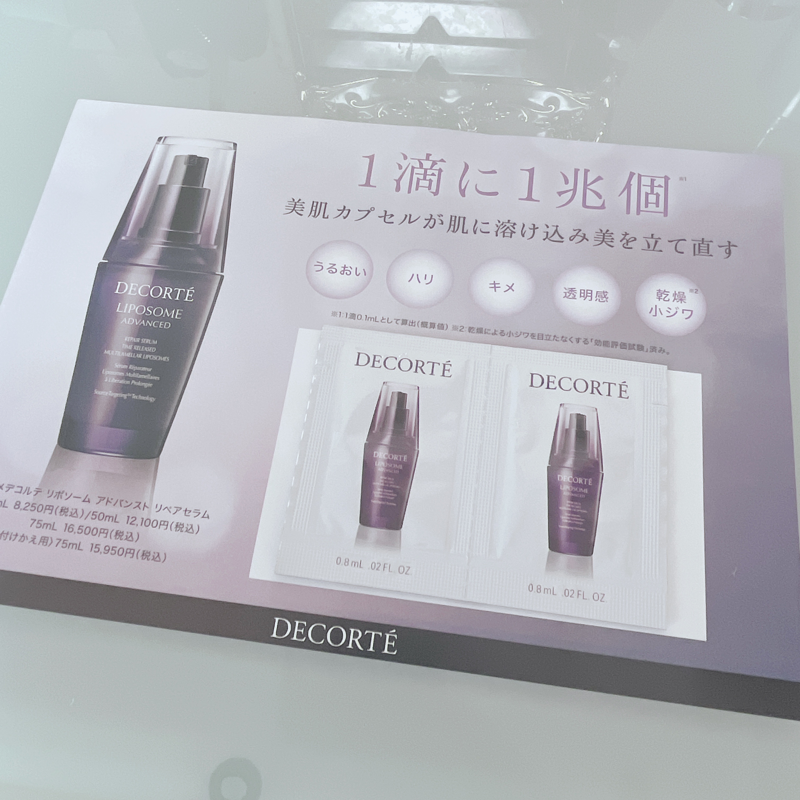 DECORTÉ リポソームアドバンスト リペアセラムサンプルをいただきました。花粉で敏感な時期もヒリヒリせず使えます。この美容液を使うと化粧水の馴染みが良くなり、クリームまでのスキンケアを終えると肌がツヤツヤになっています。プチプラのスキンケ...