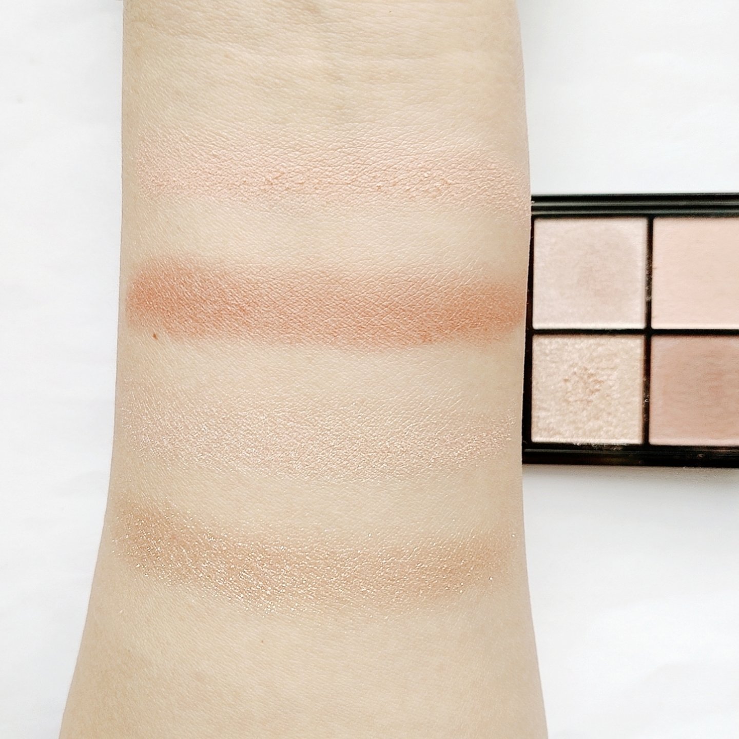 プチプラのクオリティじゃないっ!! 発売前からチェックしていたけれど、ここまで可愛いとは…😆 絶妙カラーで目もとのくすみを飛ばして*明るい印象に🩷 横割りグラデーションでメイクし、立体感をより出したかったので最後に1番左のカラーを上まぶたの真ん中と涙袋にのせています🙆 肌馴染みも良くて粉飛びも感じにくかったです💕 ブラウンの方も店頭に出てたら買おうかな💓