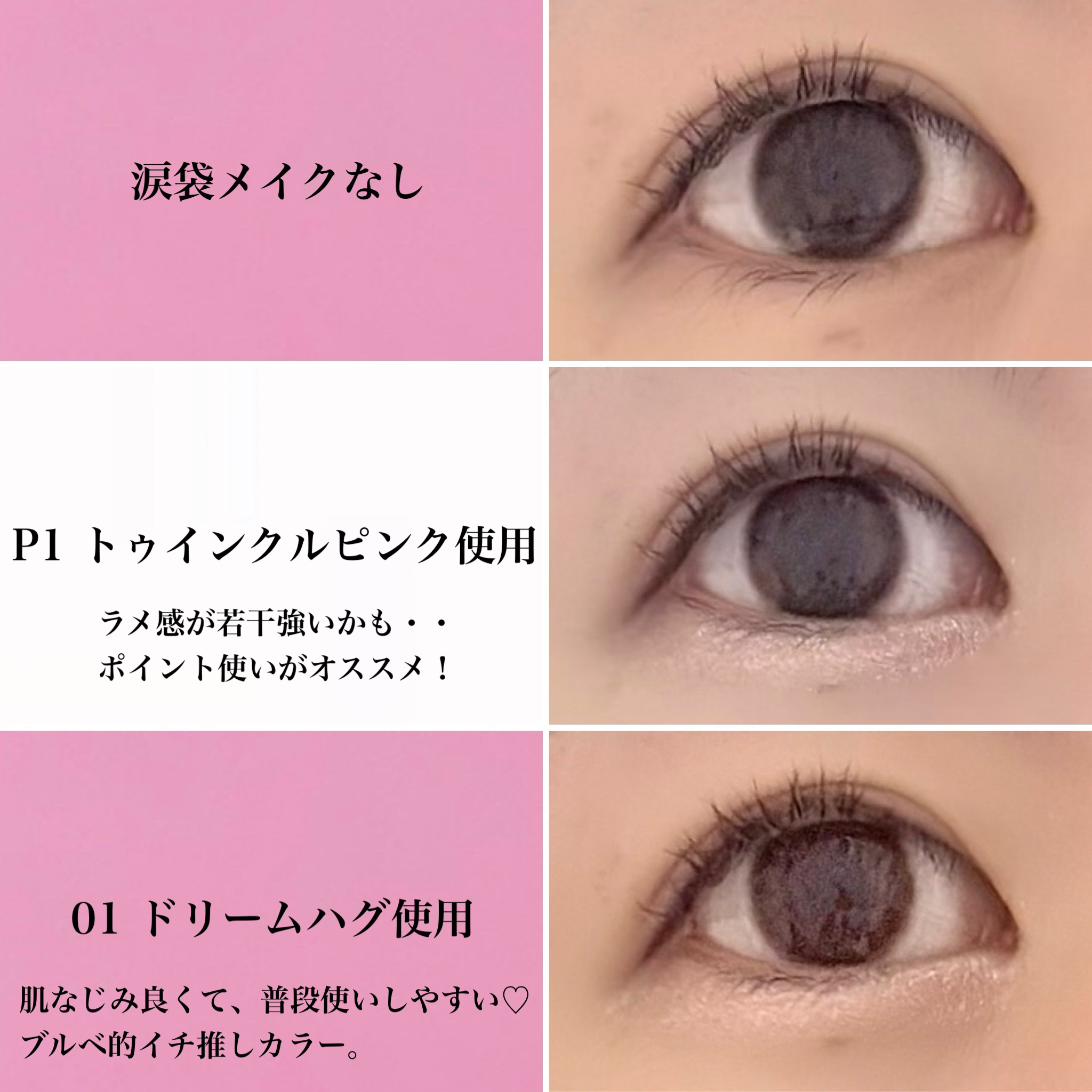 「P1 トゥインクルピンク」は、 定番カラーの「01 ドリームハグ」に ラメ感&ほんのり白味をプラスしたカラー。 青味寄りのベビーピンク。 「01 ドリームハグ」より ペンシルのベースカラーが肌色に近い色味ですが、 ラメ感が強いので、お仕事メイクには不向きかも😥 涙袋全体(三角ゾーン以外)に 「01 ドリームハグ」をぬる 黒目の下(涙袋の中心)に 「P1 トゥインクルピンク」をぬる Wonjungyoの涙袋ペンシルは メイク持ちが良すぎて、毎日愛用中♡