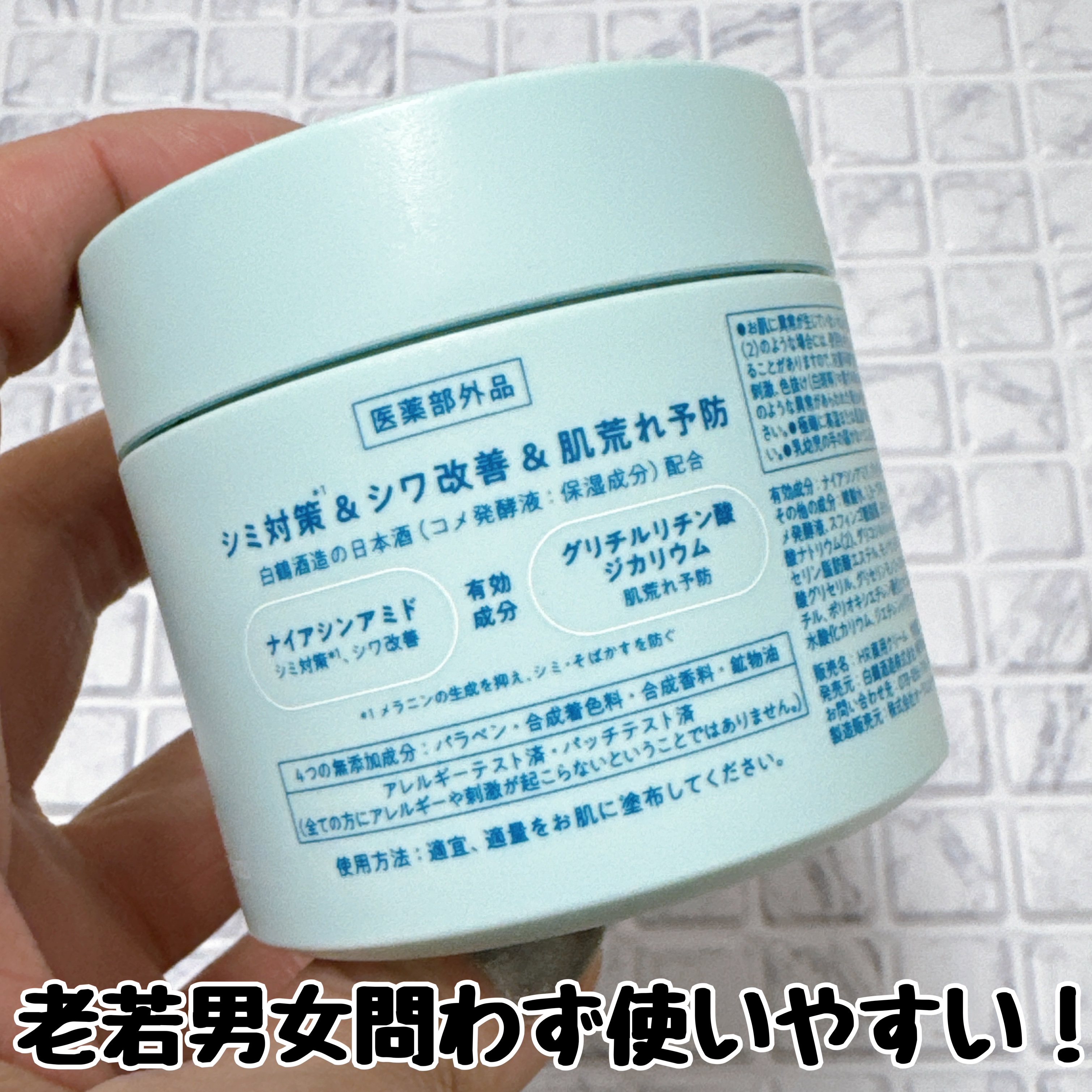 - 【医薬部外品】 シミ対策(*1)しながらシワ改善や肌荒れも予防できる、多機能な薬用オールインワンジェルクリームです。時短でエイジングケア(*2)が叶うので、忙しい人や簡単にスキンケアを済ませたい人にもおすすめです。白鶴の発酵保湿成分・コメ発酵液(日本酒)を配合したみずみずしいテクスチャでゆらぎ肌にも優しい使いごこちです。 *1メラニンの生成を抑え、シミ・そばかすを防ぐ *2年齢に応じたお手入れ