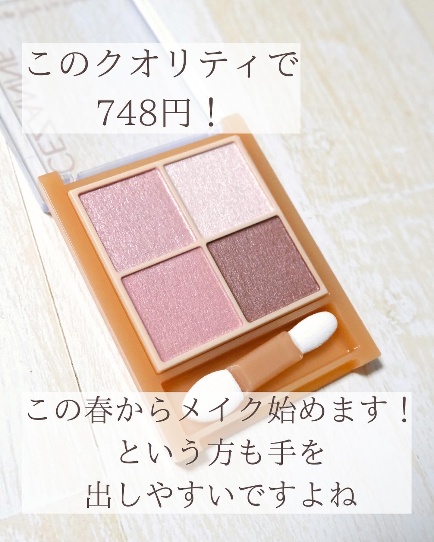 - ラメ・パール・マット3質感の4色アイシャドウ。 肌馴染みの良いベージュを基調としたカラー。ラメ・パール・マットの3質感を重ねて、自然にまぶたを強調し奥行のある大きな目元へ。 しっとり溶け込むような柔らかなパウダーなので、スルスル伸びてまぶたにピタッと密着。保湿成分(スクワラン・ホホバ種子油)配合。