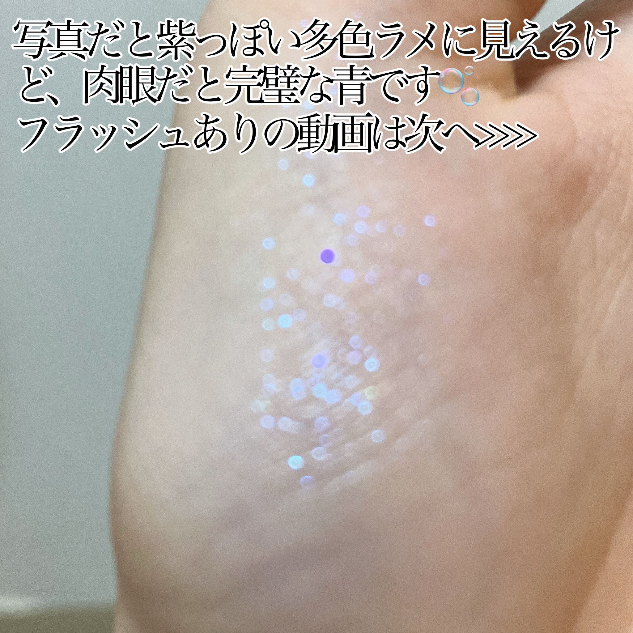 何度見てもこのパッケージ、このデザイン…… 子供だった頃の、とにかくキラキラ!!かわいいのが好き!!という欲求を思い出させますよね…………… 店頭でスウォッチしてもらうのが1番いいと思うんですが、4枚目のフラッシュありの動画が1番実際の色に近いかなと思います! ・ガッツリ青なのに、結構馴染む ・遠くからでもピカピカしてるのが分かる ・塗ったところだけ濡れてるみたいに光る ・透明感どころの騒ぎじゃない、透けます