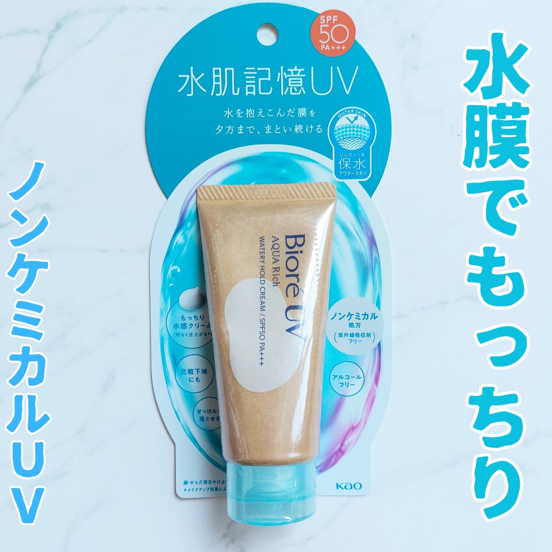 - ※2024年3月から、一部のドラッグストアで先行発売。2025年2月8日より全国発売開始。 アクアリッチシリーズ初のノンケミカルUV(紫外線吸収剤フリー)! アクアリッチウォータリーホールドクリーム(水肌記憶UV)。 約2兆個*のアクアカプセルが水を抱え込んだ膜を形成。 ✔強力紫外線をカット(SPF50/PA+++) ✔長時間肌の水分を逃がさないから、みずみずしさつづく。 もっちり水感クリーム。圧迫感の少ない軽い付け心地。 <肌を想ったこだわり> ・ノンケミカル処方(紫外線吸収剤フリー) ・アルコールフリー ・酸化亜鉛フリー ・パラベンフリー ・着色料フリー ・せっけんで落とせる *顔1回使用量の目安(0.4g)あたり