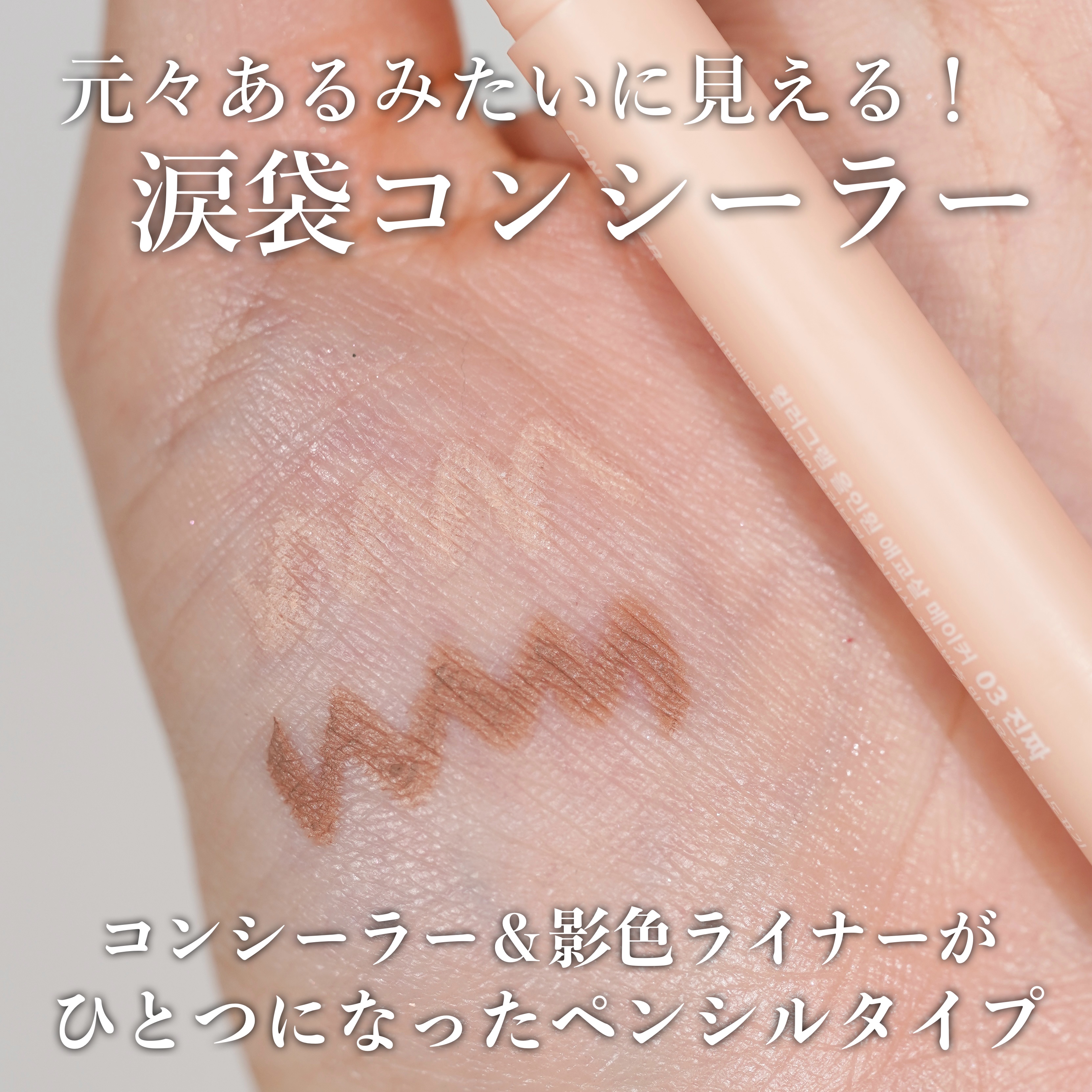 - 1.2色で簡単 涙袋完成 陰影ライナーで涙袋の影をサッと描いて 反対側のカラーシャドウで涙袋全体を埋めるだけで、 生まれつきの涙袋*のように ぷっくり自然な仕上がりに! 2. 粉飛びせずなめらかフィット 1回でスムーズに描ける柔らかい密着テクスチャー ムラなくヨレにくい、簡単にブレンディングできる クリームフォーミュラ 3. 描きやすい細芯タイプ 狭くて細い部位にも繊細なタッチでメイクが完成! 涙袋メイクに特化した #超繊細サイズ *メイクアップ効果による