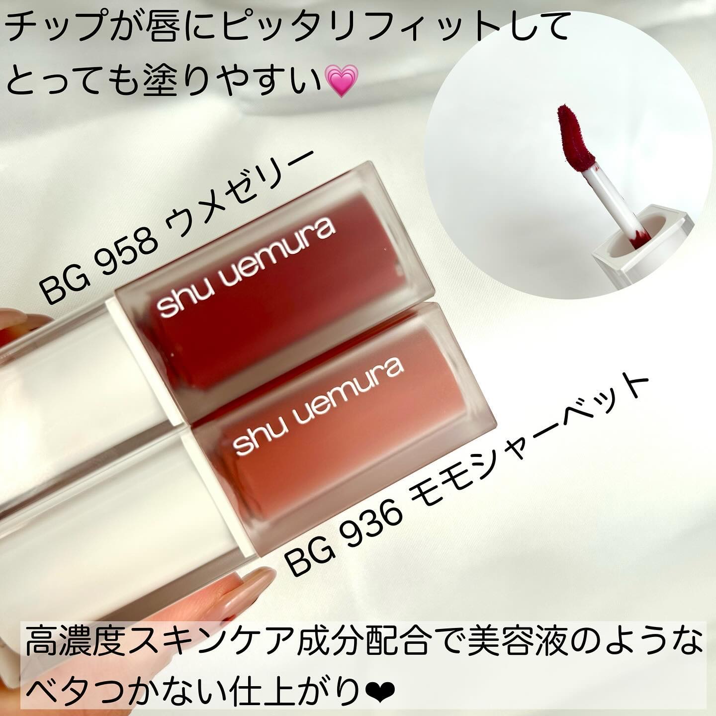 まず塗り心地 スルスル〜って塗れて発色も良い🙆♀️! ジェル膜処方だから色持ちもかなりいいなと思った! 唇にピタッとフィットしてくれる感じがあって、むちっとした唇にしてくれるのが嬉しすぎる🥹💗 04ルビーラビリンスは、ブルベさんにオススメな大人ピンク💗 10サクラシーンは黄みよりのピンクだからイエベさんにオススメ🌸💗