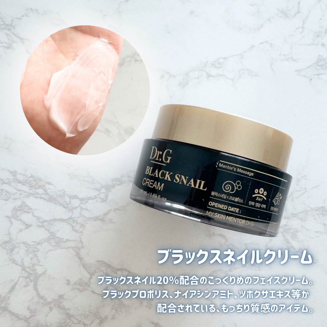このねば〜がクセになる! 弾力クリームといえばDr.Gのブラックスネイルクリーム🕊️ 高級感のあるブラック×ゴールドのパッケージ。ブラックスネイルラインはハリや弾力ケアができる年齢を重ねた肌におすすめのライン。 スネイルらしいねば〜っとしたテクスチャーが感じやすくて好き。スキンケアの締めに使うともちもちした感じに!