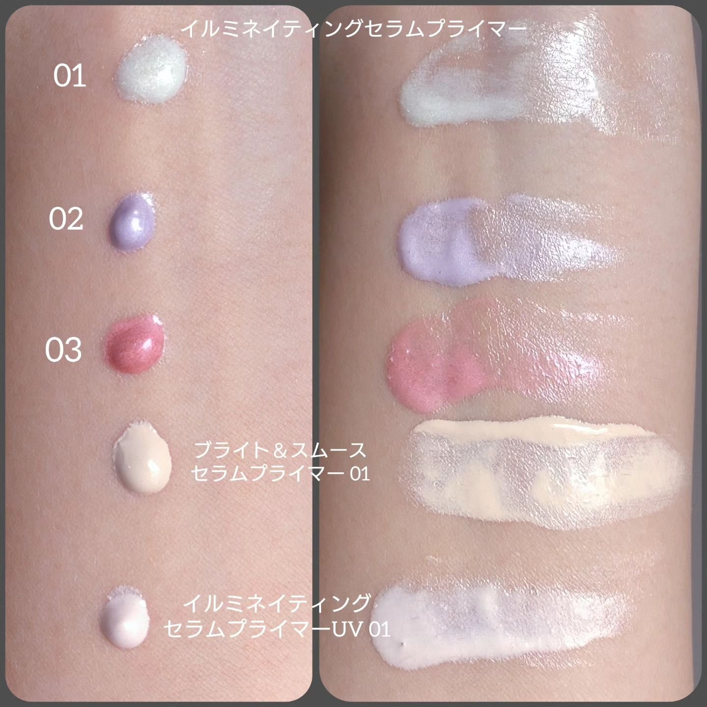 イルミの01が最もキラキラが強く、並べてみるとほんの少し緑を感じるので赤みカバーができるかも 02はくすみに 03は血色感でピンクの濃さはのばすと肌になじむ ブライトはカバー力高めでややさっぱり UVはイルミ同様みずみずしくてSPF値高め イルミ01〜03はのばすとパール感薄まるのでハイライターとしても使える ブライトは他よりカバー力高いかわりに若干キシキシを感じる UVはツヤと質感のバランスがいいけどみずみずしいから夏にはちょっと崩れやすいかも