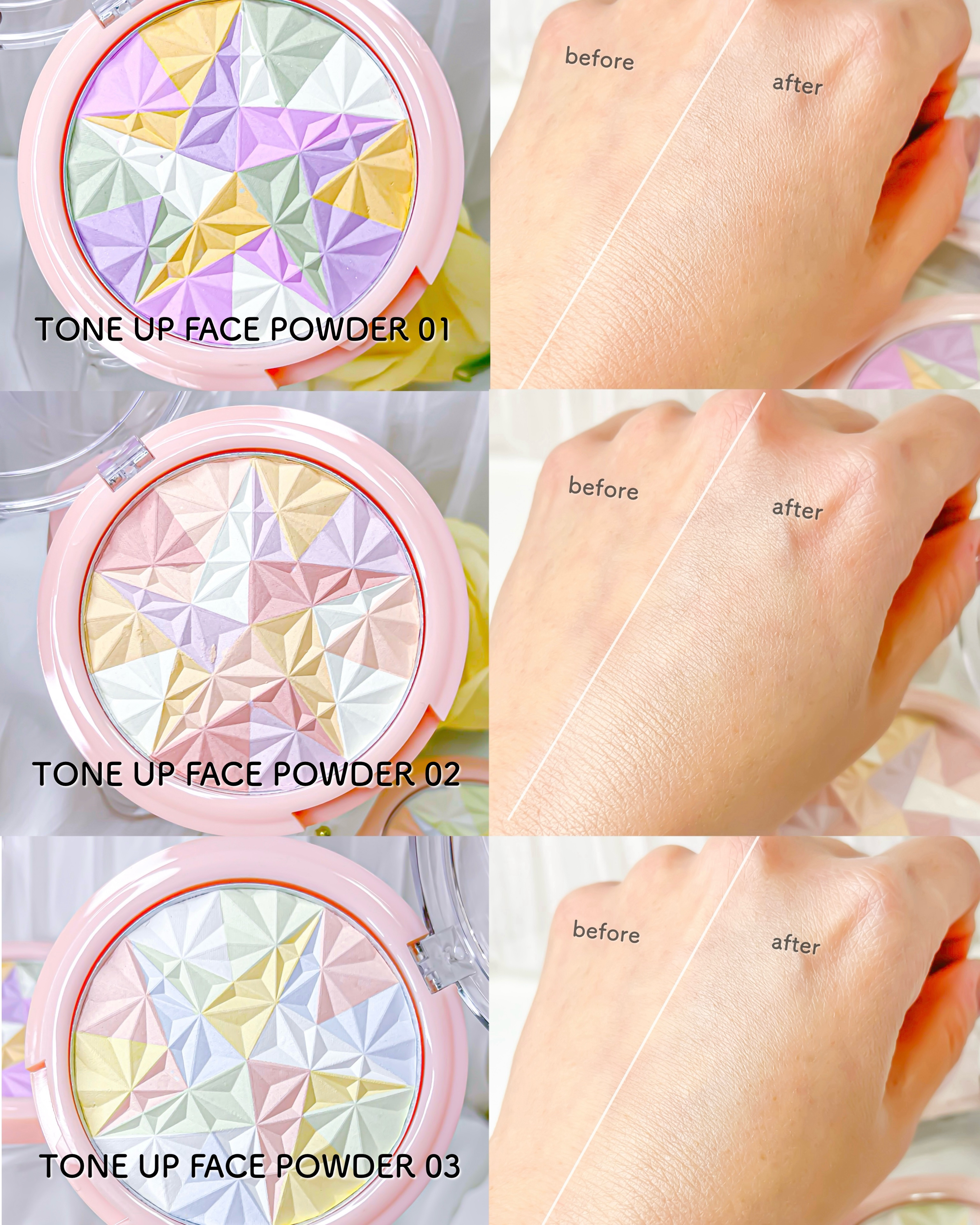 神コスパのKirei&co.から新商品が登場👏✨4色入りで税込660円って驚きの価格🫢‼️ さらにパフ付きなので凄すぎる👏✨ 4色のパウダーで肌色を明るくトーンアップしてくれて、シルキーな透明素肌に仕上げてくれる※😆👏✨ セミマットの質感のパウダーでトーンアップ⤴️&シルキーな仕上がりに なるって嬉しい👏✨
