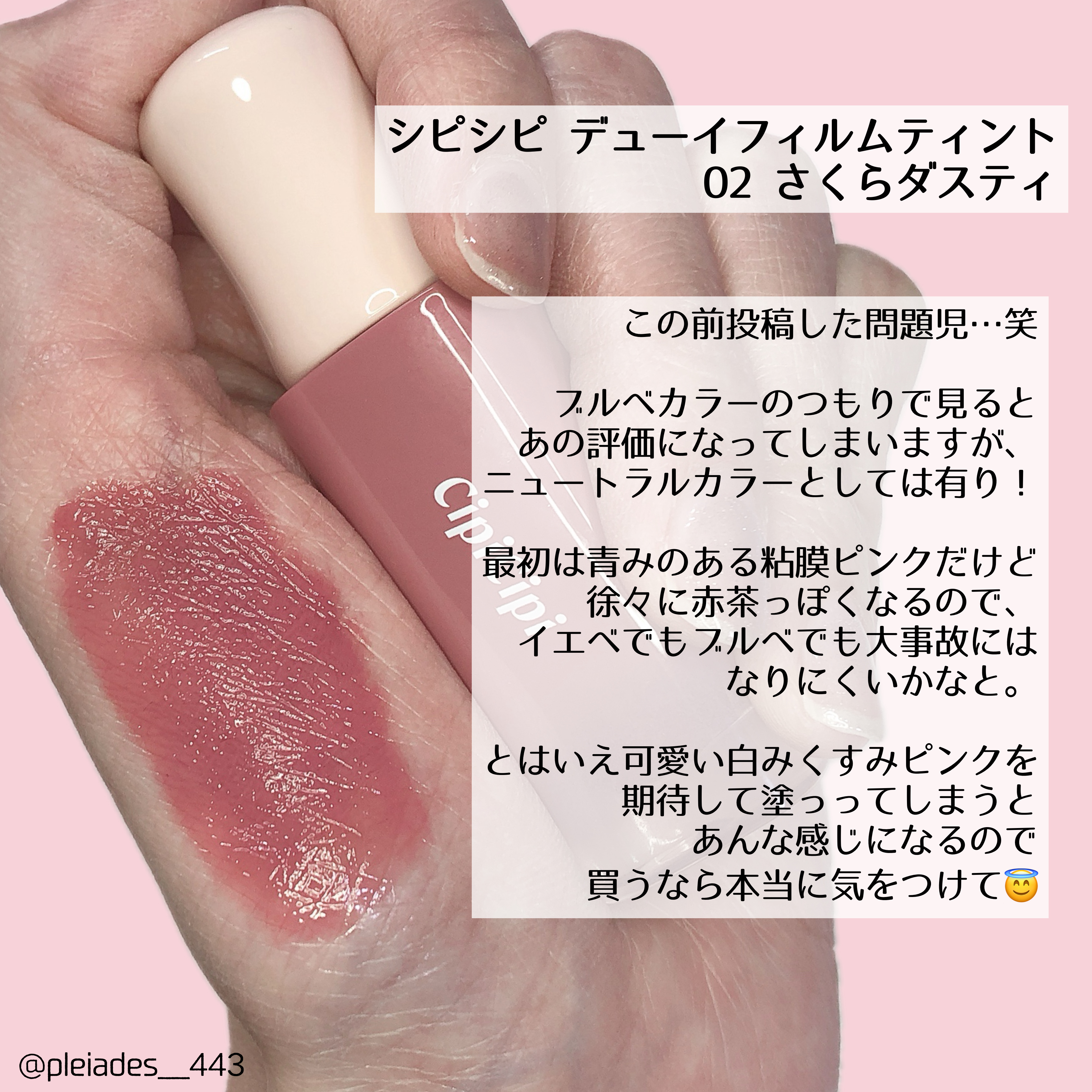 一度塗りでも高発色、ぷるんとした艶感のティントリップ。 02はやや青みのまろやかなくすみピンク。塗り重ねるほどに深みが少し出て落ち着いた秋っぽい印象に◎ イチオシはくすみが得意なブルベ夏🤍