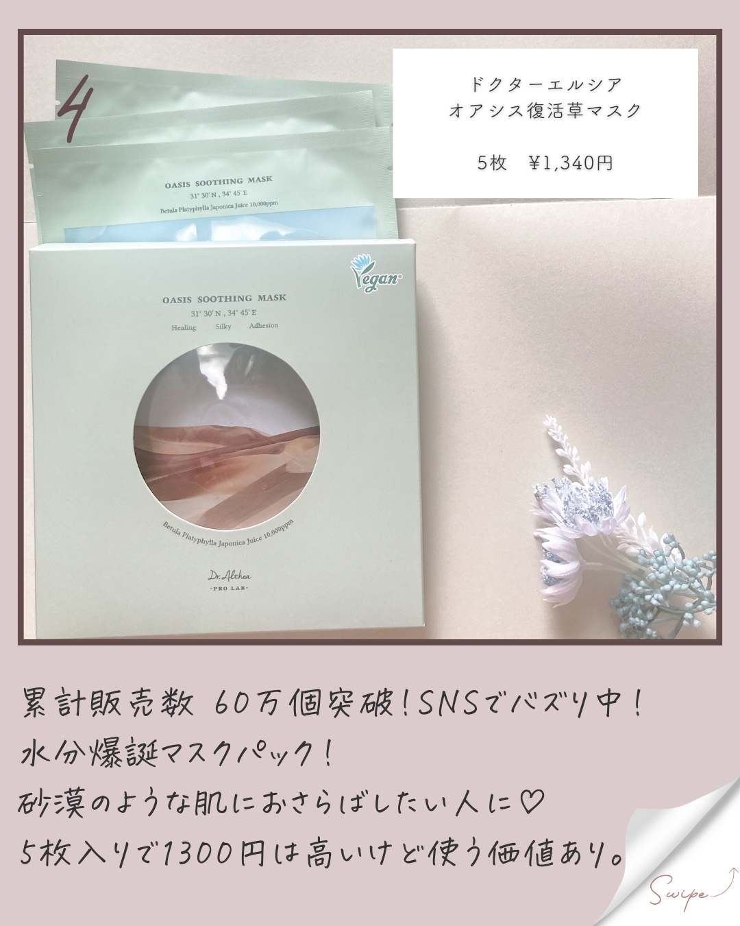 オアシスマスクって名前だけあってすごい美容液ひったひた✨ 砂漠のようなお肌にたっぷり水分補給してくれる😍 復活草、ヒアルロン酸、セラミドでしっかり保湿力を高めてくれる❣️ また、ツボクサエキス、カモミールエキス、バラエキスといった天然由来成分97%配合😆 お肌のうるおいチャージ ✅キメが整い透明感アップ ✅肌荒れにしっかりアプローチ ✅うるおうのにベタつかない ✅自然由来成分配合 ✅密着力が高く浸透力◎