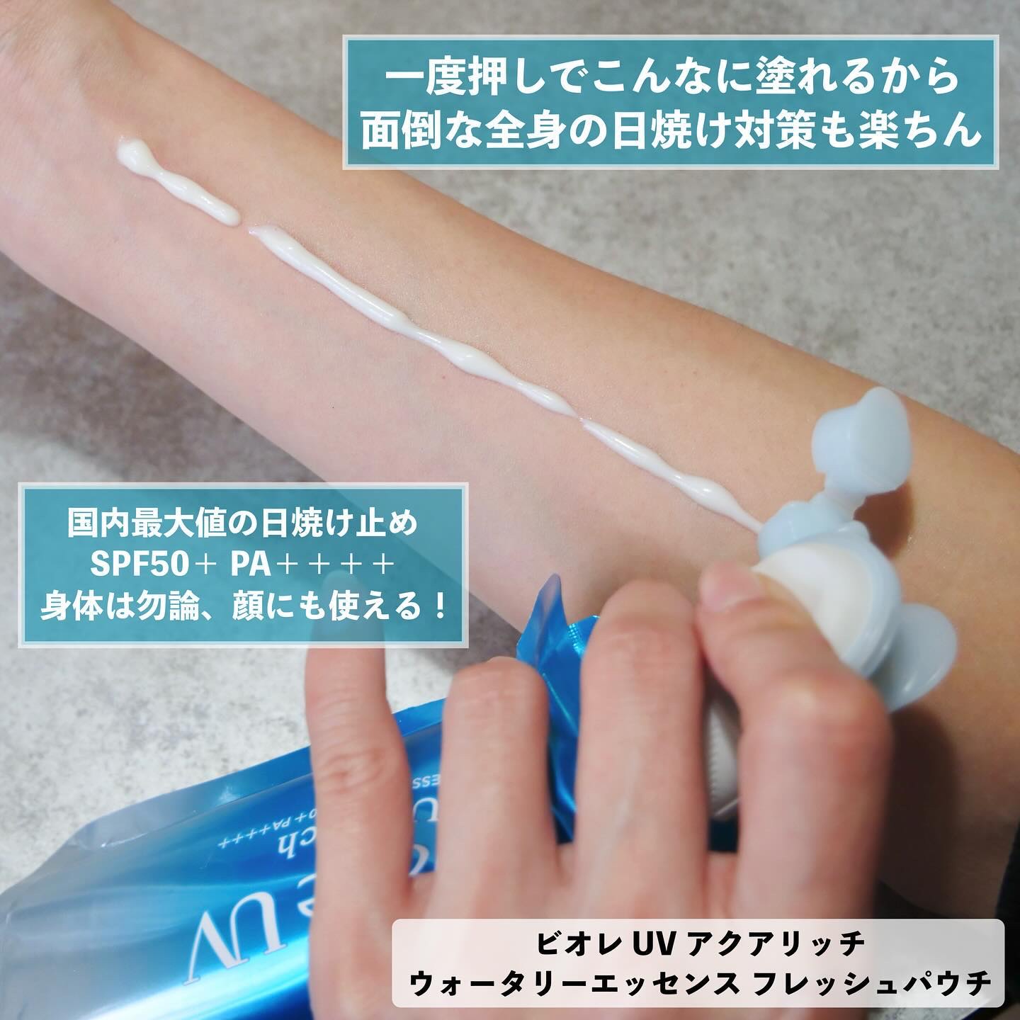 日焼け止めは惜しみ無くたっぷり使いたい🎵『ビオレアクアリッチ フレッシュパウチ』✨️【商品説明】SPF50+・PA++++高い紫外線防御効果と軽いつけ心地を両立したウォーターベースの日やけ止め。花王独自のミクロディフェンス処方により、塗布後に...
