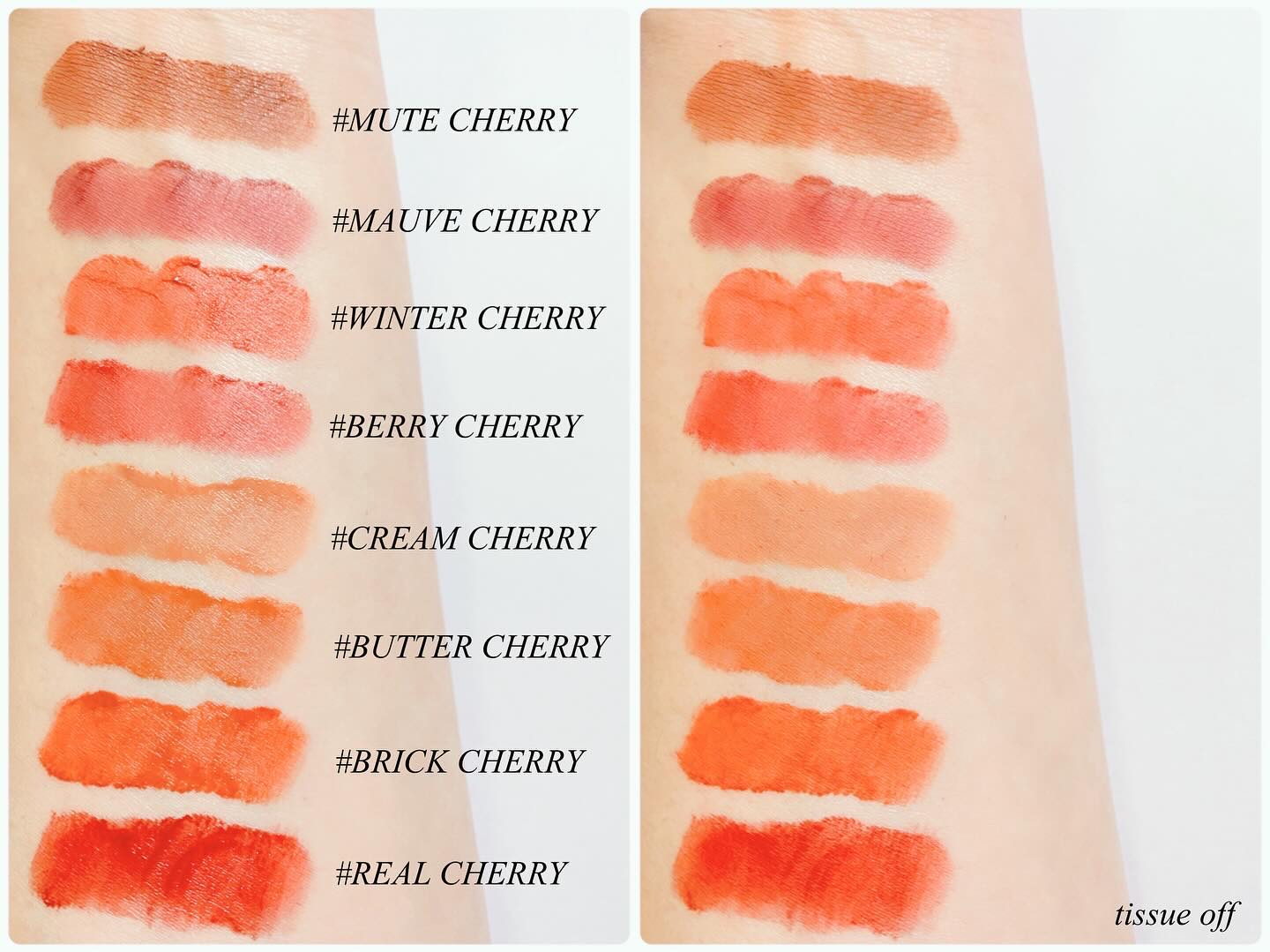 - <ウィンターピンク> ダイメジメチコン、イソドデカン、合成フルオロフロゴパイト、(ジメチコン/ビニルジメチコン)クロスポリマー、トリイソステアリン酸ポリグリセリル-2、ポリイソブテン、トリメチルシロキシケイ酸、シリカ、二酸化チタン、1,2-ヘキサンジオール、赤色201号、黄色4号、黄色酸化鉄、ビニルジメチコン/メチコンシルセスキオキサン)クロスポリマー、黒色酸化鉄、赤色104号(1)、エチルヘキシルグリセリン、精製水 <モーブチェリー> ダイメジメチコン、イソドデカン、合成フルオロフロゴパイト、(ジメチコン/ビニルジメチコン)クロスポリマー、トリイソステアリン酸ポリグリセリル-2、ポリイソブテン、トリメチルシロキシケイ酸、二酸化チタン、シリカ、1,2-ヘキサンジオール、赤色202号、黄色酸化鉄、ビニルジメチコン/メチコンシルセスキオキサン)クロスポリマー、黒色酸化鉄、赤色酸化鉄、赤色104号(1)、エチルヘキシルグリセリン、精製水 <ミュートチェリー> ダイメジメチコン、イソドデカン、合成フルオロフロゴパイト、(ジメチコン/ビニルジメチコン)クロスポリマー、トリイソステアリン酸ポリグリセリル-2、ポリイソブテン、トリメチルシロキシケイ酸、二酸化チタン、シリカ、黄色酸化鉄、1,2-ヘキサンジオール、ビニルジメチコン/メチコンシルセスキオキサン)クロスポリマー、赤色酸化鉄、黒色酸化鉄、赤色202号、エチルヘキシルグリセリン、精製水 <ベリーチェリー> ダイメジメチコン、イソドデカン、合成フルオロフロゴパイト、(ジメチコン/ビニルジメチコン)クロスポリマー、トリイソステアリン酸ポリグリセリル-2、ポリイソブテン、トリメチルシロキシケイ酸、シリカ、酸化チタン、赤色酸化鉄、黄色4号、1,2-ヘキサンジオール、赤色202号、ビニルジメチコン/メチコンシルセスキオキサン)クロスポリマー、黒色酸化鉄、エチルヘキシルグリセリン、精製水 <クリームチェリー> ダイメジメチコン、イソドデカン、合成フルオロフロゴパイト、(ジメチコン/ビニルジメチコン)クロスポリマー、トリイソステアリン酸ポリグリセリル-2、ポリイソブテン、トリメチルシロキシケイ酸、二酸化チタン、シリカ、1,2-ヘキサンジオール、黄色酸化鉄、赤色104号(1)、ビニルジメチコン/メチコンシルセスキオキサン)クロスポリマー、赤色酸化鉄、黒色酸化鉄、エチルヘキシルグリセリン、精製水 <バターチェリー> ダイメジメチコン、イソドデカン、合成フルオロフロゴパイト、(ジメチコン/ビニルジメチコン)クロスポリマー、トリイソステアリン酸ポリグリセリル-2、ポリイソブテン、トリメチルシロキシケイ酸、二酸化チタン、シリカ、赤色酸化鉄、1,2-ヘキサンジオール、黄色酸化鉄、ビニルジメチコン/メチコンシルセスキオキサン)クロスポリマー、黒色酸化鉄、赤色202号、黄色4号、エチルヘキシルグリセリン、精製水 <リアルチェリー> ダイメジメチコン、イソドデカン、合成フルオロフロゴパイト、(ジメチコン/ビニルジメチコン)クロスポリマー、赤色40号、トリイソステアリン酸ポリグリセリル-2、ポリイソブテン、トリメチルシロキシケイ酸、赤色227号、シリカ、1,2-ヘキサンジオール、ビニルジメチコン/メチコンシルセスキオキサン)クロスポリマー、赤色酸化鉄、エチルヘキシルグリセリン、香料 <ブリックチェリー> ダイメジメチコン、イソドデカン、合成フルオロフロゴパイト、(ジメチコン/ビニルジメチコン)クロスポリマー、赤色40号、トリイソステアリン酸ポリグリセリル-2、ポリイソブテン、トリメチルシロキシケイ酸、赤色227号、シリカ、1,2-ヘキサンジオール、ビニルジメチコン/メチコンシルセスキオキサン)クロスポリマー、赤色酸化鉄、エチルヘキシルグリセリン、香料