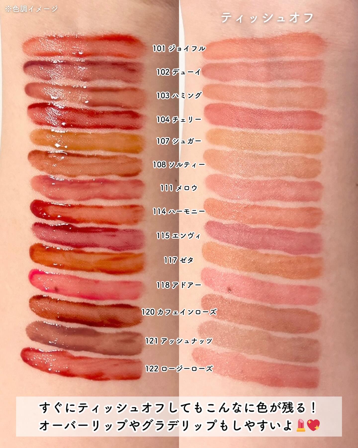 - <101 ジョイフル> 水、リンゴ酸ジイソステアリル、ダイマージリノール酸(フィトステリル/イソステアリル/セチル/ステアリル/ベヘニル)、ジイソステアリン酸ダイマージリノレイル、ノナイソステアリン酸ポリグリセリル-10、オクチルドデカノール、ビスジグリセリルポリアシルアジペート-2、水添ポリイソブテン、セチルPEG/PPG-10/1ジメチコン、ポリソルベート60(小麦由来)、イソステアリン酸ソルビタン(小麦由来)、1,2-ヘキサンジオール、グリセリン、ベヘニルアルコール、(アクリル酸/MA)コポリマーNa、ペンチレングリコール、BG、ポリアクリレート-13、トロメタミン、(アクリレーツ/アクリル酸アルキ ル(C10-30 )クロスポリマー、エチルヘキシルグリセリン、ポリイソブテン、(アクリル酸ヒドロキシエチル/アクリロイルジメチルタウリンNa)コポリマー、スクワラン、デヒドロ酢酸、ステビオシド、香料、フィチン酸、カプリリルグリコール、ジメチコン、水添ロジン酸メチル、水酸化Al、ポリソルベート20(小麦由来)、トコフェロール、ライム果汁、キイチゴ果汁、レモン果汁、マンゴー果汁、フラガリアチロエンシス果汁、アンズ果汁、オレンジ果汁、グレープフルーツ液汁、キウイ果汁、パパイア果汁、[+/-]酸化チタン、黄4、黄5、赤 104(1)、赤227、青1 <102 デューイ> 水、リンゴ酸ジイソステアリル、ダイマージリノール酸(フィトステリル/イソステアリル/セチル/ステアリル/ベヘニル)、ジイソステアリン酸ダイマージリノレイル、ノナイソステアリン酸ポリグリセリル-10、オクチルドデカノール、ビスジグリセリルポリアシルアジペート-2、水添ポリイソブテン、セチルPEG/PPG-10/1ジメチコン、ポリソルベート60(小麦由来)、イソステアリン酸ソルビタン(小麦由来)、1,2-ヘキサンジオール、グリセリン、ベヘニルアルコール、(アクリル酸/MA)コポリマーNa、ペンチレングリコール、BG、ポリアクリレート-13、トロメタミン、(アクリレーツ/アクリル酸アルキル(C10-30))クロスポリマー、エチルヘキシルグリセリン、ポリイソブテン、(アクリル酸ヒドロキシエチル/アクリロイルジメチルタウリンNa)コポリマー、スクワラン、デヒドロ酢酸、ステビオシド、香料、フィチン酸、ジメチコン、水添ロジン酸メチル、水酸化Al、カプリリルグリコール、ポリソルベート20(小麦由来)、トコフェロール、ライム果汁、キイチゴ果汁、レモン果汁、マンゴー果汁、フラガリアチロエンシス果汁、アンズ果汁、オレンジ果汁、グレープフルーツ液汁、キウイ果汁、パパイア果汁、酸化チタン、赤227、黄5、黄4、青1 <103 ハミング> 水、リンゴ酸ジイソステアリル、ダイマージリノール酸(フィトステリル/イソステアリル/セチル/ステアリル/ベヘニル)、ジイソステアリン酸ダイマージリノレイル、ノナイソステアリン酸ポリグリセリル-10、オクチルドデカノール、ビスジグリセリルポリアシルアジペート-2、水添ポリイソブテン、セチルPEG/PPG-10/1ジメチコン、ポリソルベート60(小麦由来)、イソステアリン酸ソルビタン(小麦由来)、1,2-ヘキサンジオール、グリセリン、ベヘニルアルコール、(アクリル酸/MA)コポリマーNa、ペンチレングリコール、BG、ポリアクリレート-13、トロメタミン、(アクリレーツ/アクリル酸アルキル(C10-30))クロスポリマー、エチルヘキシルグリセリン、ポリイソブテン、(アクリル酸ヒドロキシエチル/アクリロイルジメチルタウリンNa)コポリマー、スクワラン、デヒドロ酢酸、ステビオシド、香料、フィチン酸、ジメチコン、水添ロジン酸メチル、水酸化Al、カプリリルグリコール、ポリソルベート20(小麦由来)、トコフェロール、ライム果汁、キイチゴ果汁、レモン果汁、マンゴー果汁、フラガリアチロエンシス果汁、アンズ果汁、オレンジ果汁、グレープフルーツ液汁、キウイ果汁、パパイア果汁、酸化チタン、黄5、赤227、青1 <104 チェリー> 水、リンゴ酸ジイソステアリル、ダイマージリノール酸(フィトステリル/イソステアリル/セチル/ステアリル/ベヘニル)、ジイソステアリン酸ダイマージリノレイル、ノナイソステアリン酸ポリグリセリル-10、オクチルドデカノール、ビスジグリセリルポリアシルアジペート-2、水添ポリイソブテン、セチルPEG/PPG- 10/1ジメチコン、イソステアリン酸ソルビタン(小麦由来)、ポリソルベート60(小麦由来)、1,2-ヘキサンジオール、グリセリン、ベヘニルアルコール、(アクリル酸/MA)コポリマーNa、ペンチレングリコール、BG、ポリアクリレート-13、ト ロメタミン、(アクリレーツ/アクリル酸ア ルキル(C10-30))クロスポリマー、エチルヘキシルグリセリン、ポリイソブテ ン、(アクリル酸ヒドロキシエチル/アクリ ロイルジメチルタウリンNa)コポリマー、スクワラン、デヒドロ酢酸、ステビオシド、香料、カプリリルグリコール、ポリソルベー ト20(小麦由来)、トコフェロール、ライム果汁、キイチゴ果汁、レモン果汁、マンゴー 果汁、フラガリアチロエンシス果汁、アンズ 果汁、オレンジ果汁、グレープフルーツ液 汁、キウ