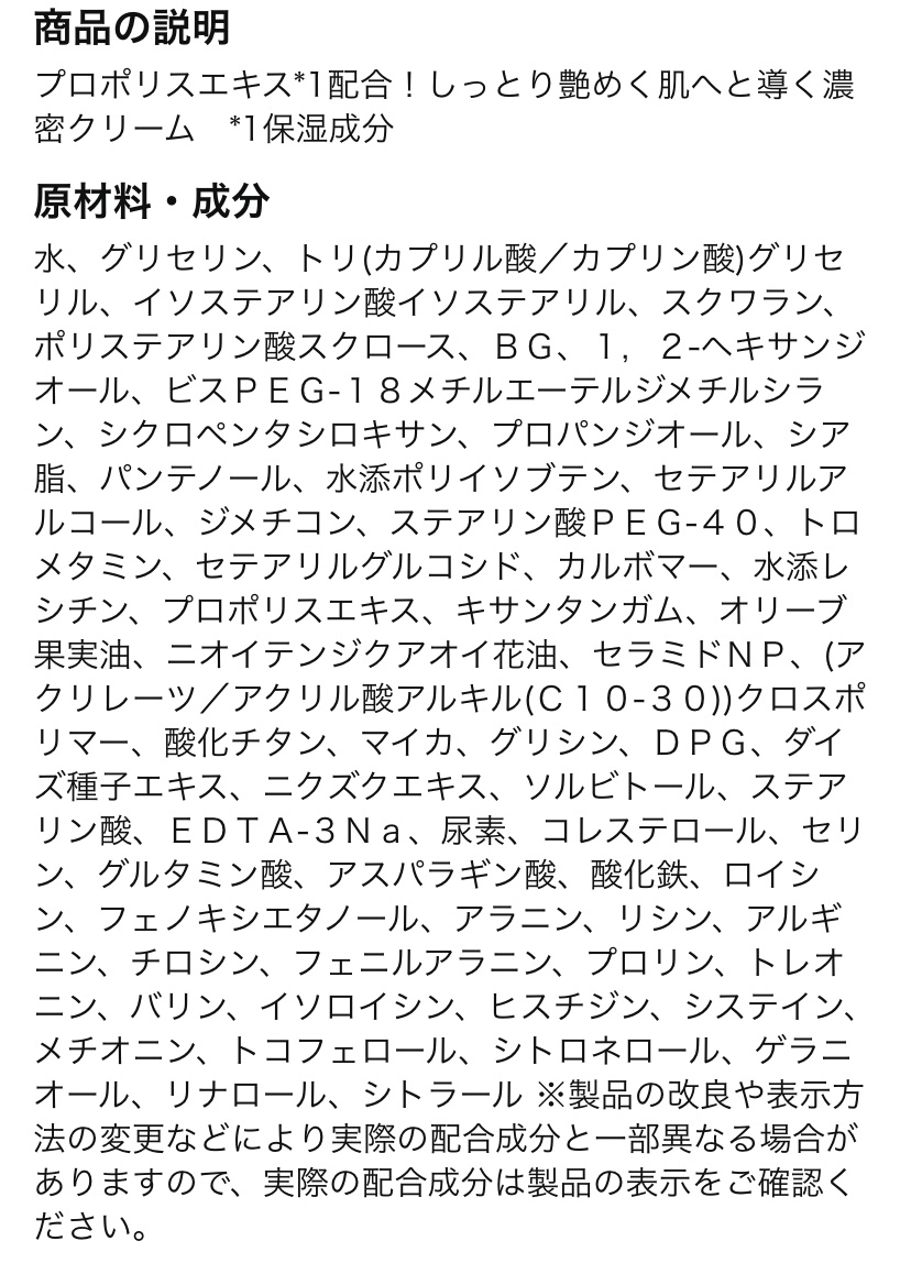 - しっとり艶めく肌へと導くエイジングケア(※1)用保湿クリームです。 こだわりのプロポリスエキス(※2)と濃縮されたセラミド(※2)のパワーでうるおいをチャージして、しっとりと艶めく肌へ。 オールシーズン使いやすい、なめらかでみずみずしいテクスチャーです。 ※1年齢に応じたスキンケア ※2保湿成分