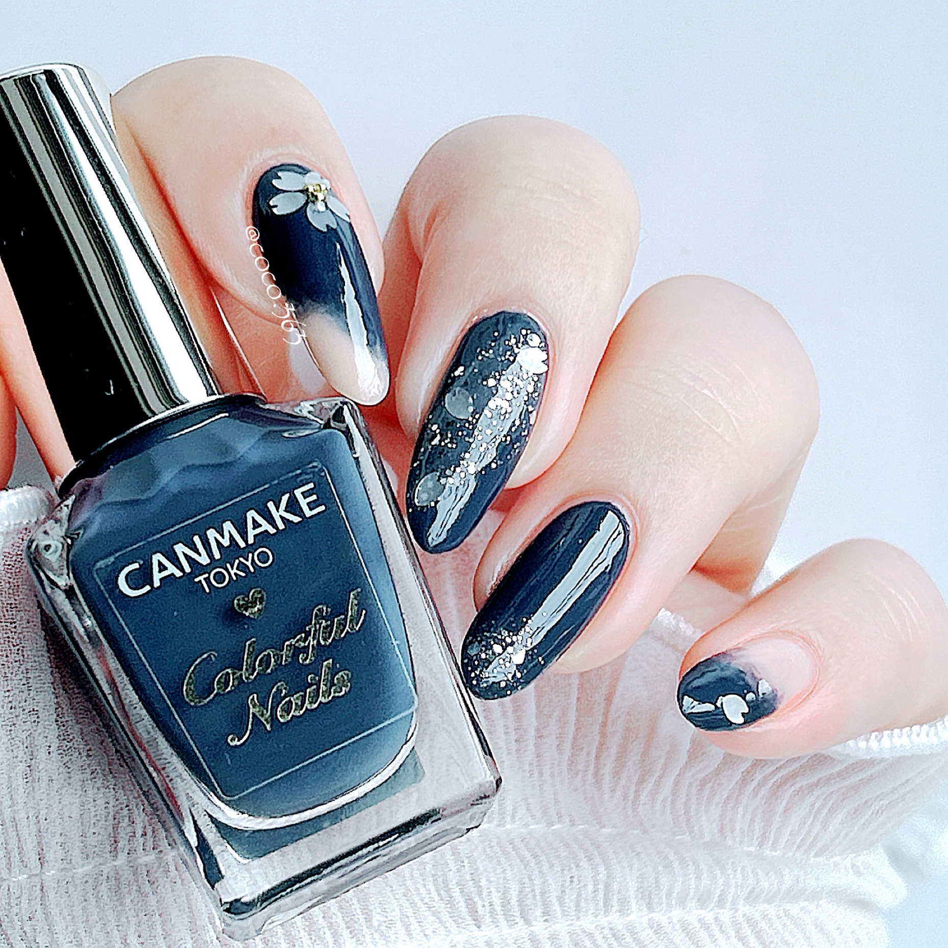 夜桜イメージな幻想的ニュアンス🌸💙 How toは5枚目に😘 ホワイトを塗る時は、トップコートで薄めてからお好みの箇所にふわ〜っと重ねると🙆♀️ 人差し指と小指はN82番を2度塗りしました✨