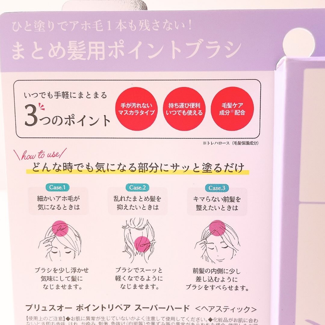 ホールド力のあるポイントリペア✨ 元々白い普通のタイプを使っていたのですが、こちらのはしっかりホールドしてくれてとてもいいです! アホ毛やシースルー前髪も作りやすく、ブラシも大きいので一気に広範囲にぬれるのも便利◎ ジャスミン&リリーの香りもいい香り✨ まとめ髪や前髪セット、アホ毛抑えなどとっても便利なのでおすすめです!