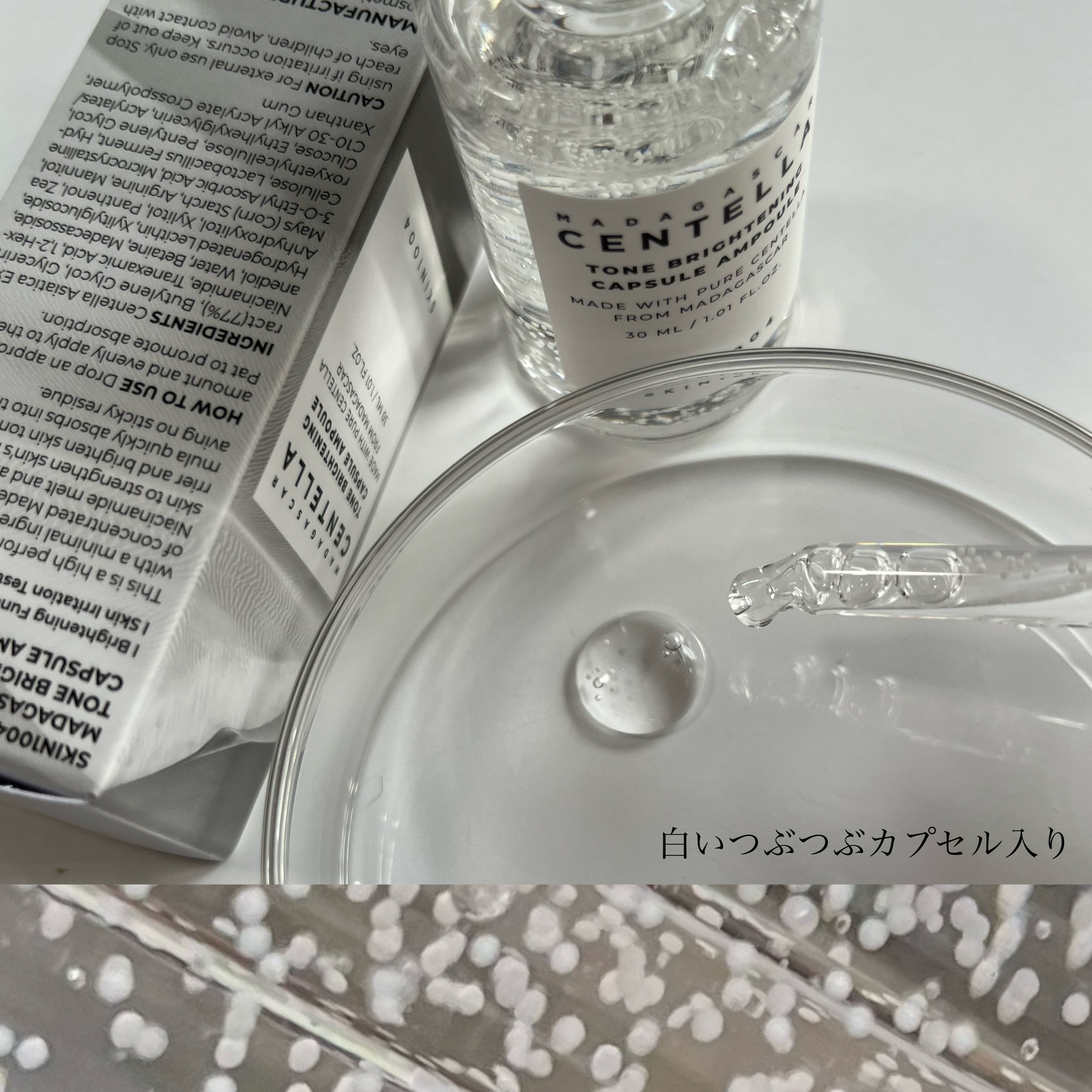 白いつぶつぶカプセルが目を惹くブライトニングアンプル🤍 見た目から透明感や明るさを連想させてくれて期待感が高まります😆 マダガスカル産のCICA成分によって夏の紫外線ダメージとか、これからの季節だと乾燥だったり寒暖差だったりとさまざまな外部刺激から肌を鎮静させてケアしてくれるんだって🌿 MADE WHITEが肌をやさしく引き締めながら美しいツヤ肌を叶えてくれるそうなので明るい肌を目指したい私にピッタリ💖