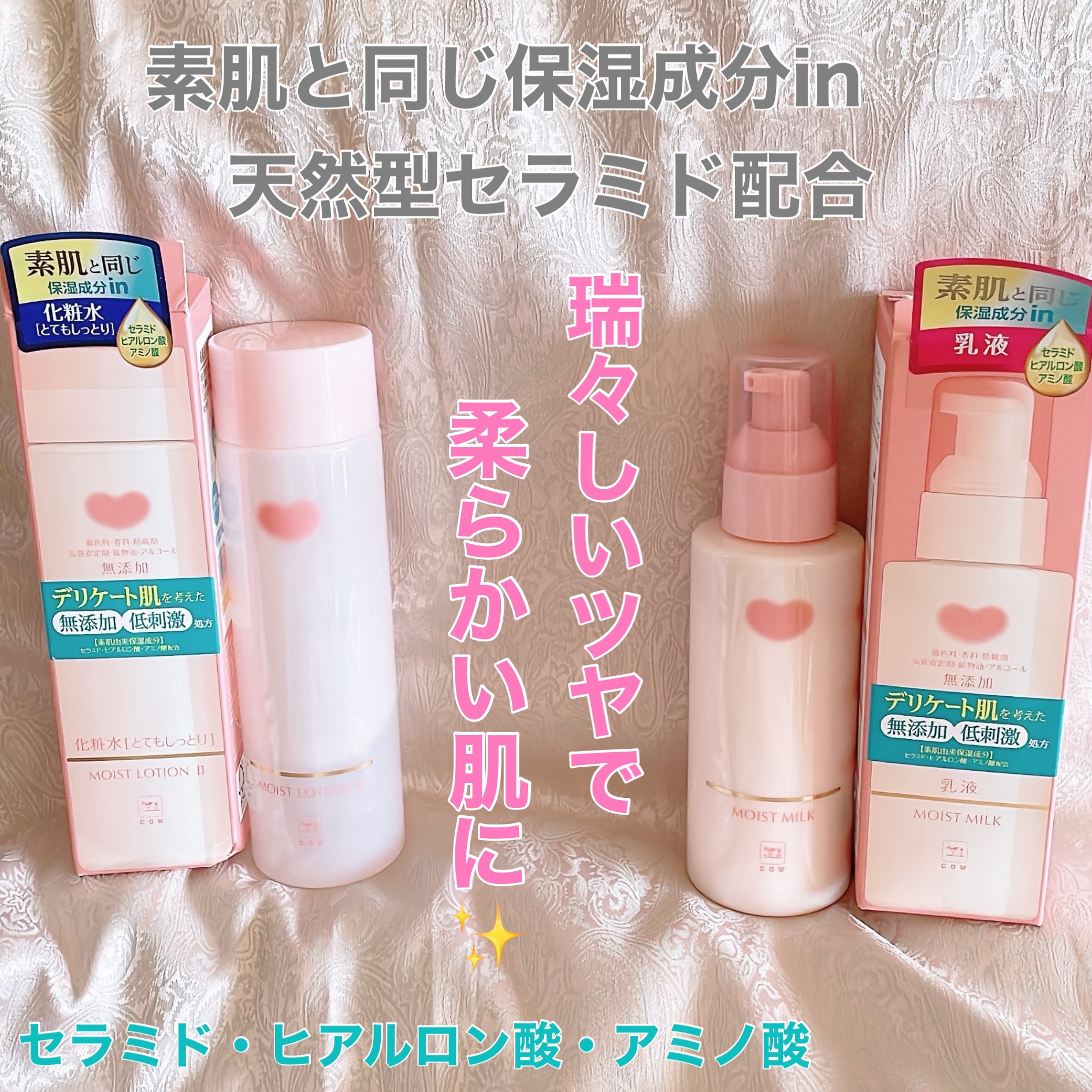 赤箱で有名な牛乳石鹸の会社から出ている「カウブランド無添加」のスキンケアシリーズ。 素肌由来保湿成分<セラミド、ヒアルロン酸、アミノ酸(グリシン)>配合✨ しっとりするのにべたつかない、リッチな使いごこち🫧