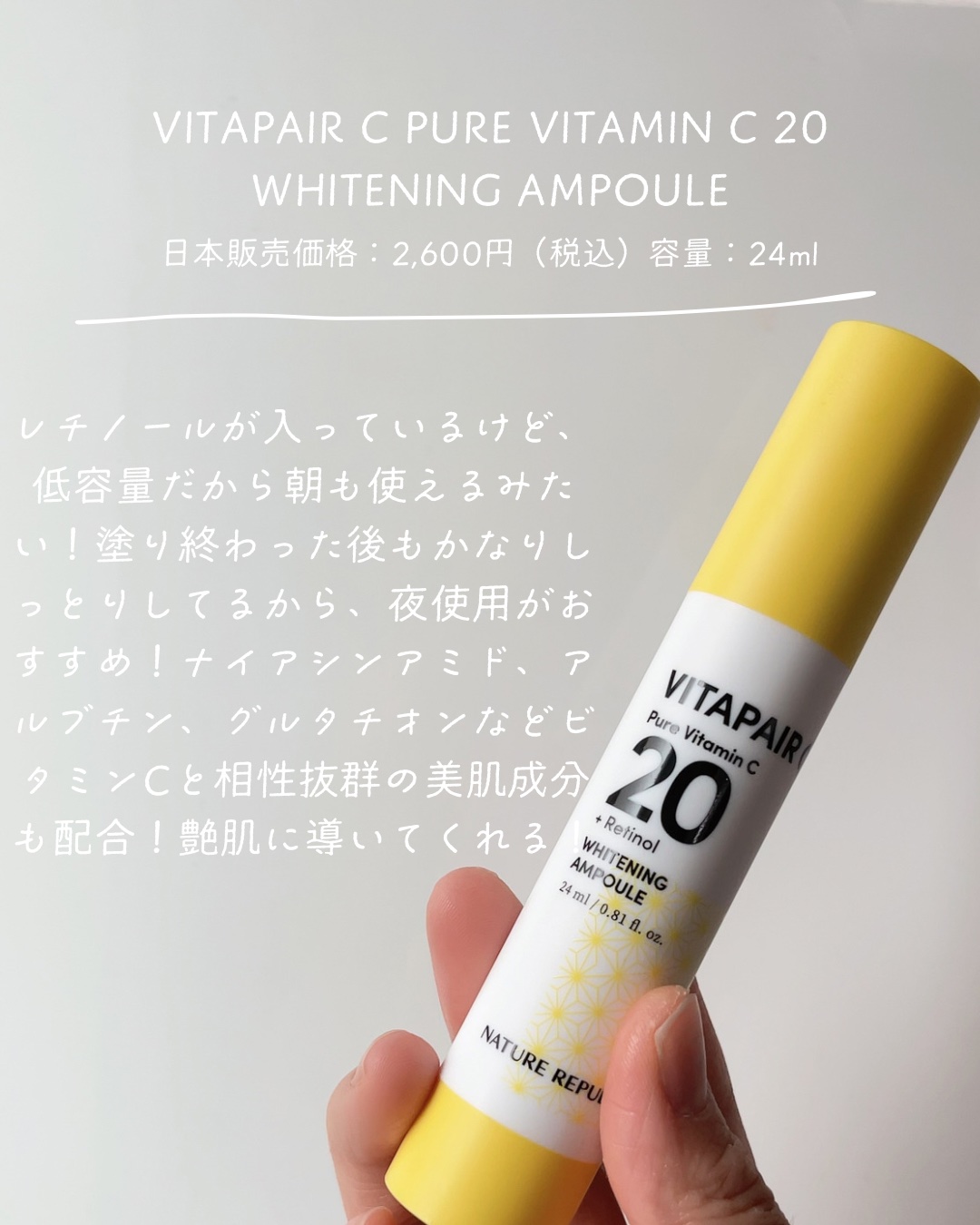 シミやくすみケアで人気のビタミンC美容液!🍋✨ まず香りですが、ほぼ無臭! テクスチャーはさらさらで軽め。 スーッと伸びて、肌にすぐ馴染む感じです◎ こちらの美容液はマイルドな使い心地で、安心して毎日続けられそうです☺️