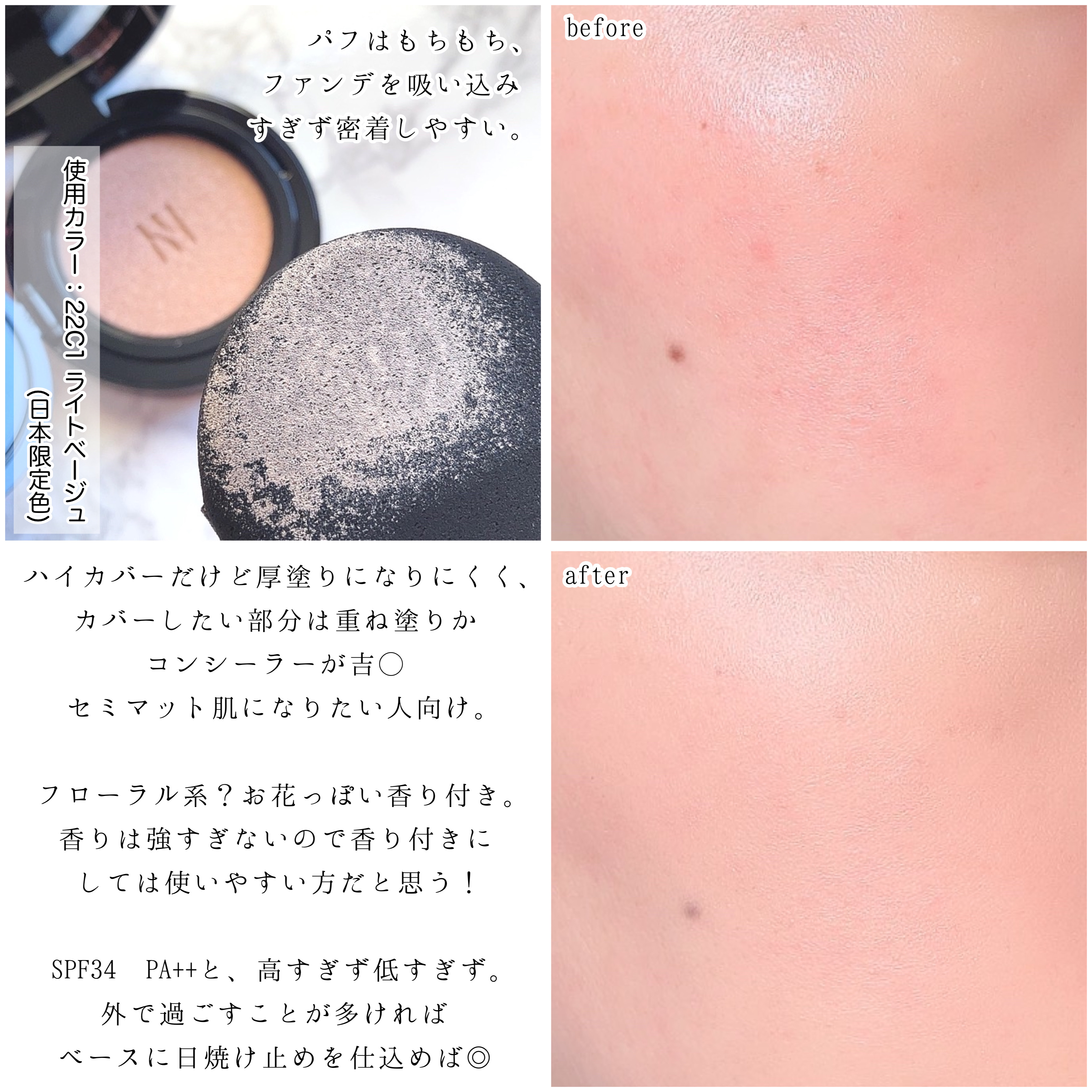 - きめ細かく肌にフィットして密着するレイヤーレスカバー 素肌のように軽いベルベット肌が24時間*1つづくクッションファンデ 1.Layerless Matte Cover 薄く均一なカバー力を叶える「マグネフィットパウダー」と 肌の凸凹にきめ細かくなめらかに密着する「3レイヤーフィルム」を採用 ハイカバーなのに軽やかなフィット感 2.24 Hour High-End Stay 4つの特性で叶える完成度の高いフローレス肌が24時間*1持続 マスクプルーフ効果*1 3.Asian Skin Fit Shade アジア人女性の肌に合わせて設計された全7色のシェードバリエーション クッションファンデーションに最適な、少し明るめのブルーベース~ニュートラルトーン さまざまな肌色にマッチするシェードで、もっとも自分らしい肌トーンを演出