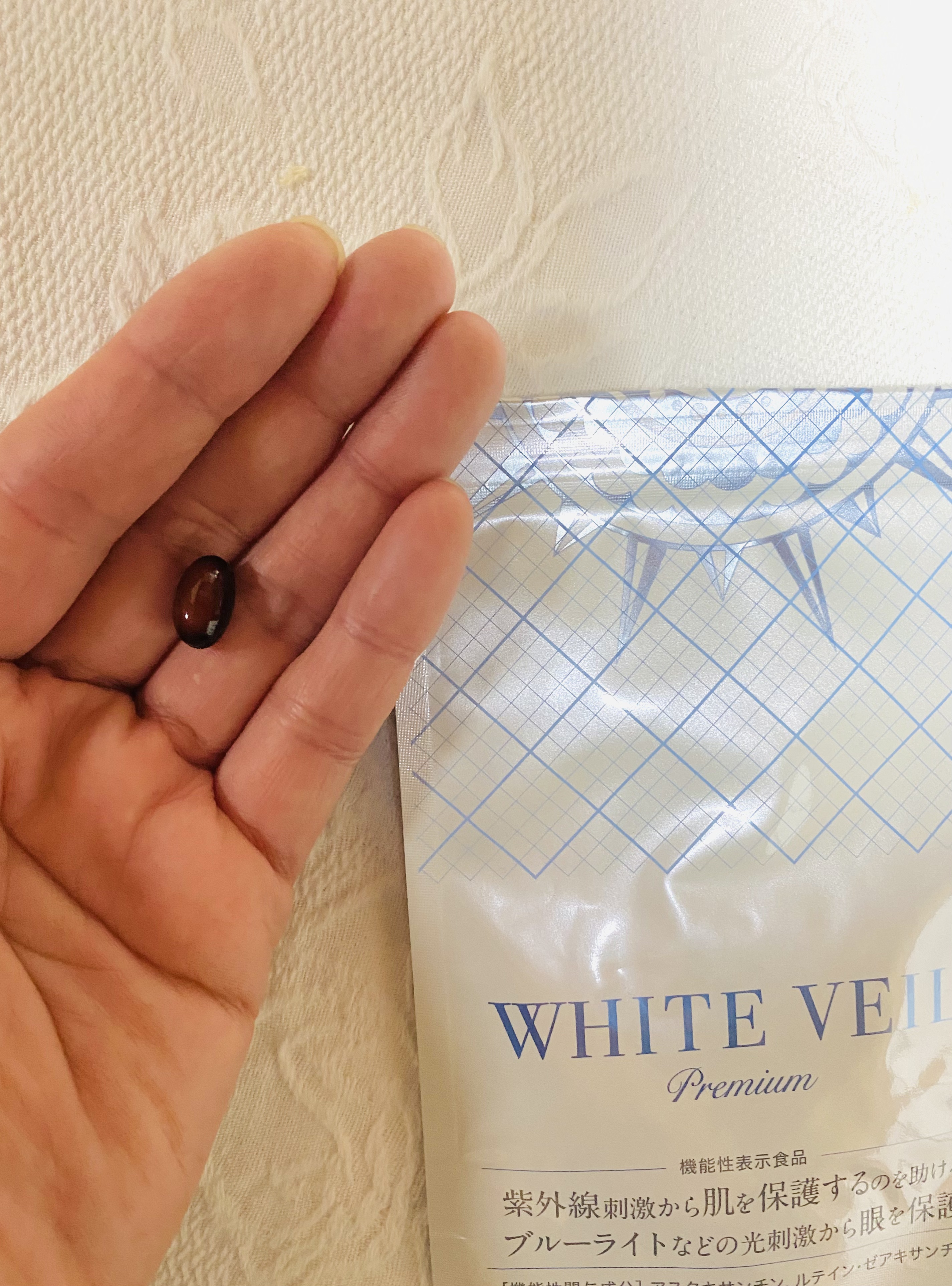 キラ★リズムホワイトヴェールプレミアム今年の夏も3ヶ月飲み続けてた。効果あるかないかわからないけど、なんとなく飲まないと不安になってしまう😅小さめのつるんとした粒。1日一粒飲むだけ。気になる香りもなく飲みやすい形状です。ブルーライトもカットし...